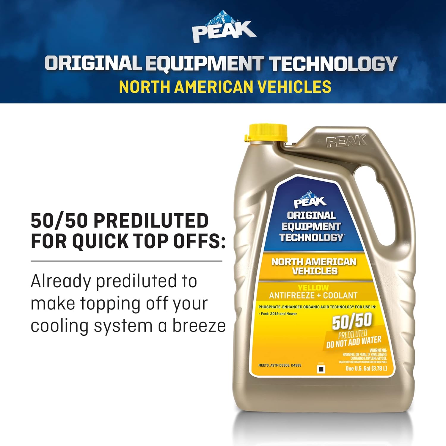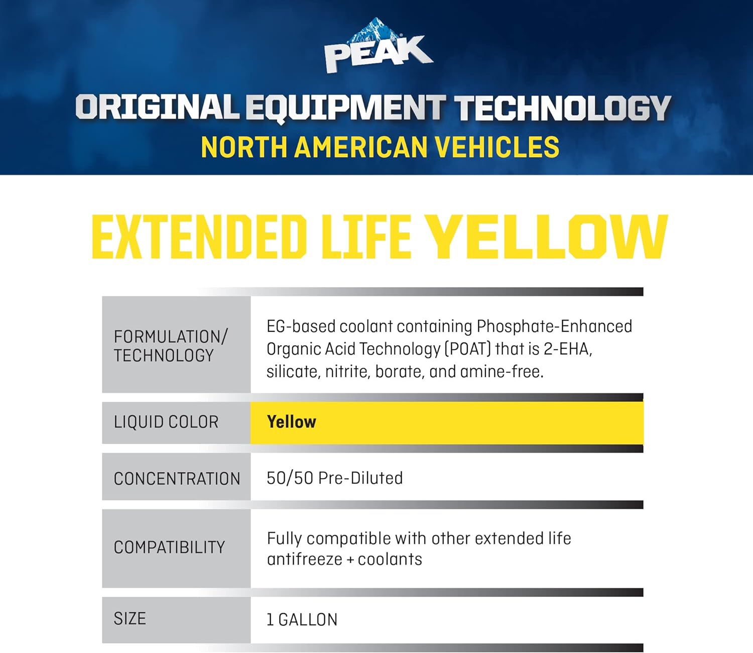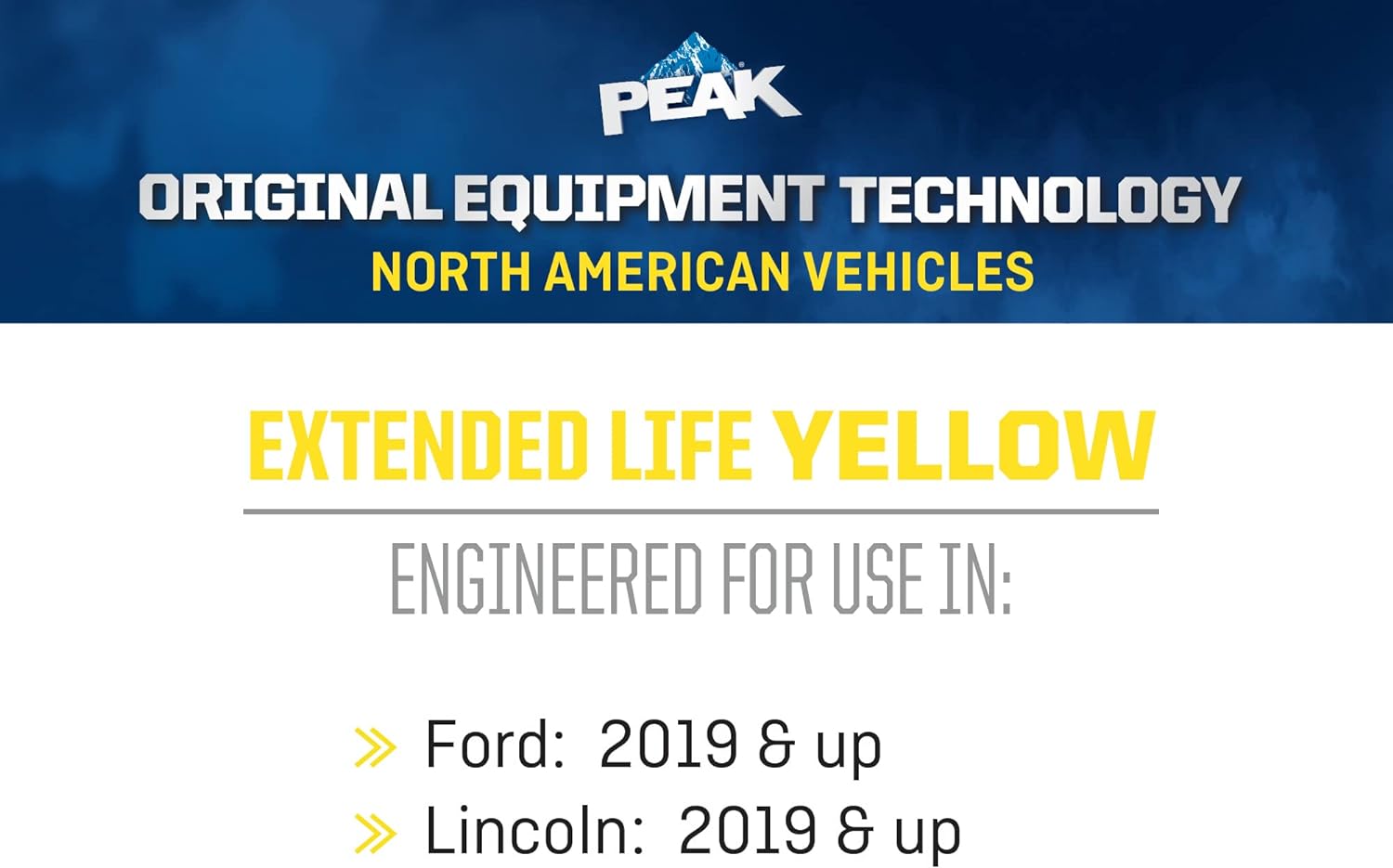 PEAK Original Equipment Technology Extended Life Yellow 50/50 Prediluted Antifreeze + Coolant for North American Vehicles is a premium coolant specifically designed to match the technology and color requirements of your North American vehicle, and is formulated with the same corrosion inhibitor technology that protected your vehicle straight from the factory. PEAK OET North American Extended Life 50/50 Prediluted Antifreeze + Coolant is an ethylene glycol-based formula specifically developed for use in any North American vehicle requiring a Yellow Phosphate-enhanced Organic Acid Technology (POAT) formulation, and is specifically designed to provide protection of your vehicle’s engine cooling system metals, including aluminum, against damaging rust and corrosion. It is compatible with other Yellow POAT formulations, and is perfect for flushing, filling, or topping off your cooling system. This item contains a bittering agent called Denatonium Benzoate. This 1 gallon bottle of extended-life antifreeze is recommended for use with automobiles requiring a Yellow POAT formula, including: Ford vehicles from 2019 & newer and other North American vehicles requiring a Yellow coolant formulation. When installed as part of a complete flush and coolant fill, PEAK guarantees this coolant will provide service life protection of up to 150,000 miles or 5 years.
