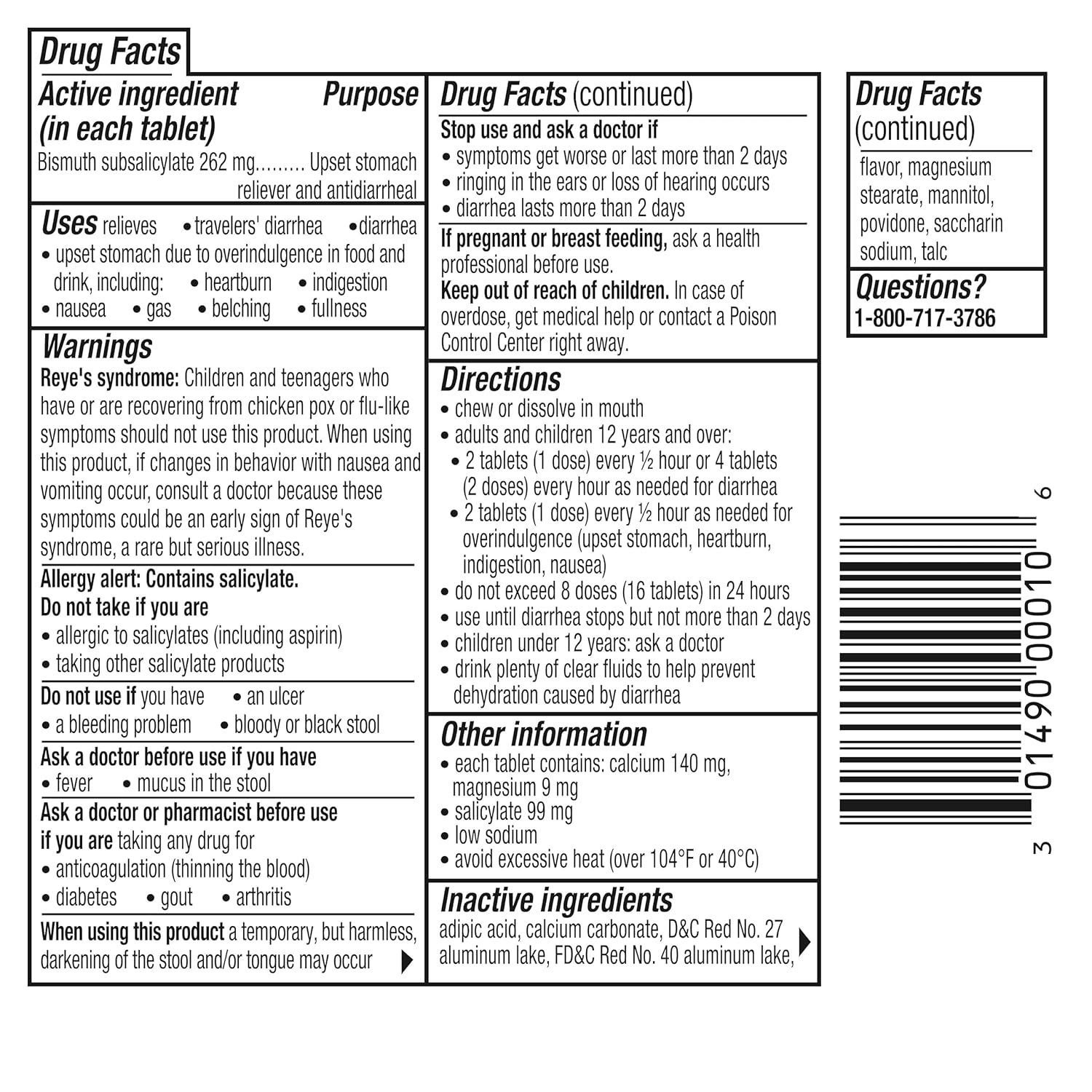 Pepto Bismol Cherry Chewable Tablets. When you need upset stomach relief, Pepto coats, calms and soothes your stomach, providing fast digestive relief from nausea, heartburn, indigestion, upset stomach, and diarrhea. Convenient and easy to use - Pepto Bismol is formulated to coat your digestive tract to calm and soothe and provide fast and effective 5 symptom relief. The convenient chewable form allows you to take Pepto Bismol on-the-go so you can travel worry-free. Take Pepto Bismol at the first sign of digestive issues so you can get rapid relief. Pepto Bismol provides fast relief from heartburn and indigestion, that uncomfortable feeling after you eat too much. It also provides relief from multiple stomach upsets so you can get back on track fast!Pepto Bismol has been a trusted brand for the treatment of upset stomachs for over 100 years. May be HSA/ FSA eligible, please check with your provider.*Pepto is the #1 Pharmacist recommended brand based on a Pharmacy Times 2021 Survey-upset stomach remedies category.
