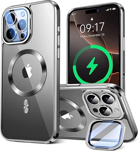 [Stand and Charge, Both at Once]Magnetic for iPhone 16 Pro Max Case with Camera Kickstand [Compatible with Mag-safe]Camera Protection, Military Drop Tested Plating Bumper, CD Ring, Slim Clear Cover-Grey