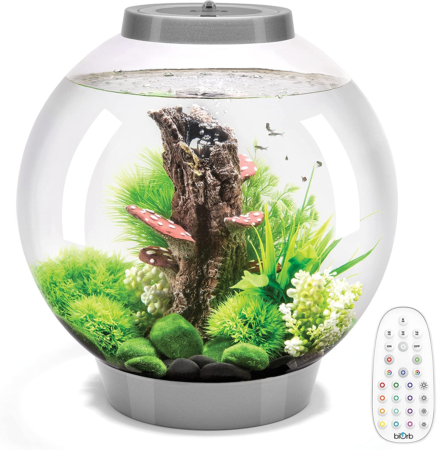These breathtaking underwater worlds add a sense of joy and wonder to your home. With chic and minimalist design, a biOrb CLASSIC 15 MCR aquarium makes it effortless for you to elevate any space. This 4-Gallon acrylic aquarium is inspired by the simple beauty of a classic fishbowl, a 360-degree view so you can admire all aspects of your biOrb. This biOrb CLASSIC has a bold silver lid and base that creates a stylish finished look to this unique aquarium. Everything you need to start your new hobby is included: low voltage pump, LED Multi-color Remote-controlled (MCR) lighting, filtration, and manual. All biOrb aquariums are made from acrylic, which is 10 times stronger and 23% clearer than glass. Acrylic is also a good insulator, so you don't lose as much heat as you would with a glass aquarium. The MCR light will change how you experience biOrb. Choose from 16 preset colors and control the brightness of the light. You can even set an automatic day and night light cycle. There's a setting to suit every mood and add to your sense of well-being. The 5-step Filtration ensures clear, healthy water with biological, mechanical and chemical filtration, water stabilization and oxygenation. Unlike most aquariums, a biOrb's filter is fitted at the bottom of the aquarium, because fish waste sinks. The ceramic media that surrounds the filter provides a large surface area for beneficial bacteria. With quick and easy set-up, you'll soon be setting your creativity free and decorating your biOrb with the endless combinations of biOrb aquarium decorations (sold separately). Additionally, biOrb aquariums are designed for easy maintenance and easy access to feed your fish. Depending on your choice of fish species, you may only need around 15 minutes of maintenance per month using the biOrb Service Kit (sold separately). The aquarium is backed by a 2-year warranty. Enjoy the priceless gift of nature's wonder in your home with biOrb.