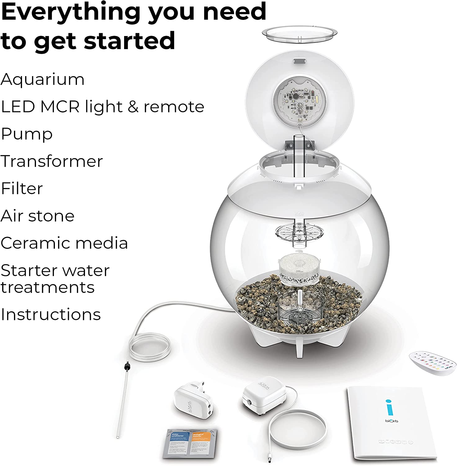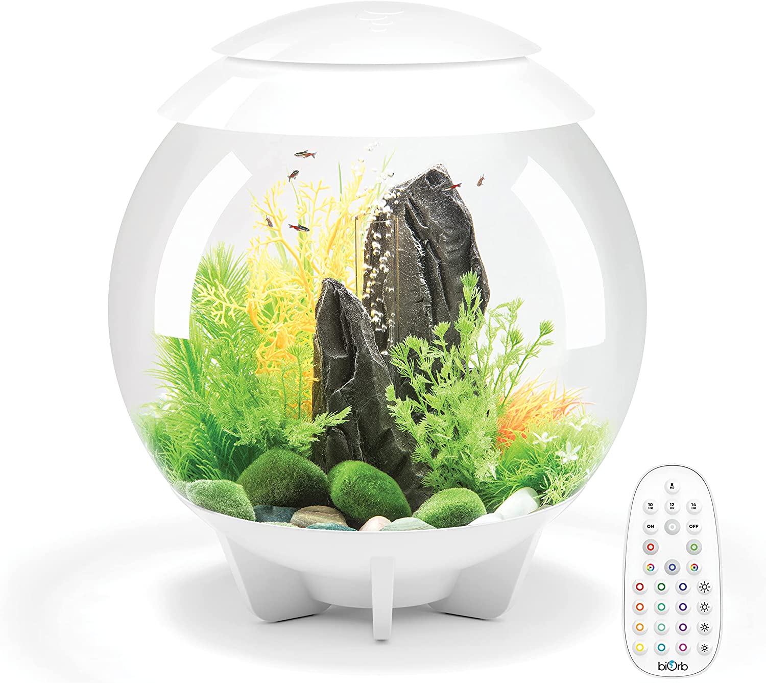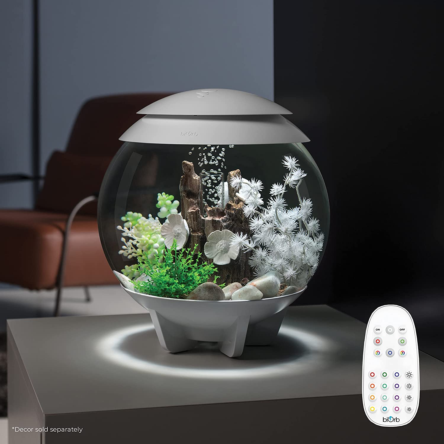 These breathtaking underwater worlds add a sense of joy and wonder to your home. With chic and minimalist design, a biOrb HALO 15 MCR aquarium makes it effortless for you to elevate any space. This 4-Gallon acrylic aquarium is inspired by the simple beauty of a classic fishbowl, but with a twist. The hidden water line and 360-degree view gives the appearance your underwater world is floating in your room. This biOrb HALO has a white lid and base. The layered design of the lid and bold base makes this aquarium truly unique. Everything you need to start your new hobby is included: low voltage pump, LED Multi-color Remote-controlled (MCR) lighting, filtration, and manual. All biOrb aquariums are made from acrylic, which is 10 times stronger and 23% clearer than glass. Acrylic is also a good insulator, so you don't lose as much heat as you would with a glass aquarium. The MCR light will change how you experience biOrb. Choose from 16 preset colors and control the brightness of the light. There's a setting to suit every mood and add to your sense of well-being. The 5-step Filtration ensures clear, healthy water with biological, mechanical and chemical filtration, water stabilization and oxygenation. Unlike most aquariums, a biOrb's filter is fitted at the bottom of the aquarium, because fish waste sinks. The ceramic media that surrounds the filter provides a large surface area for the growth of beneficial bacteria. With quick and easy set-up, you'll soon be setting your creativity free and decorating your biOrb with the endless combinations of biOrb aquarium decorations (sold separately). Additionally, biOrb aquariums are designed for easy maintenance and easy access to feed your fish. Depending on your choice of fish species, you may only need around 15 minutes of maintenance per month using the biOrb Service Kit (sold separately). The aquarium is backed by a 2-year warranty. Enjoy the priceless gift of nature's wonder in your home with biOrb.