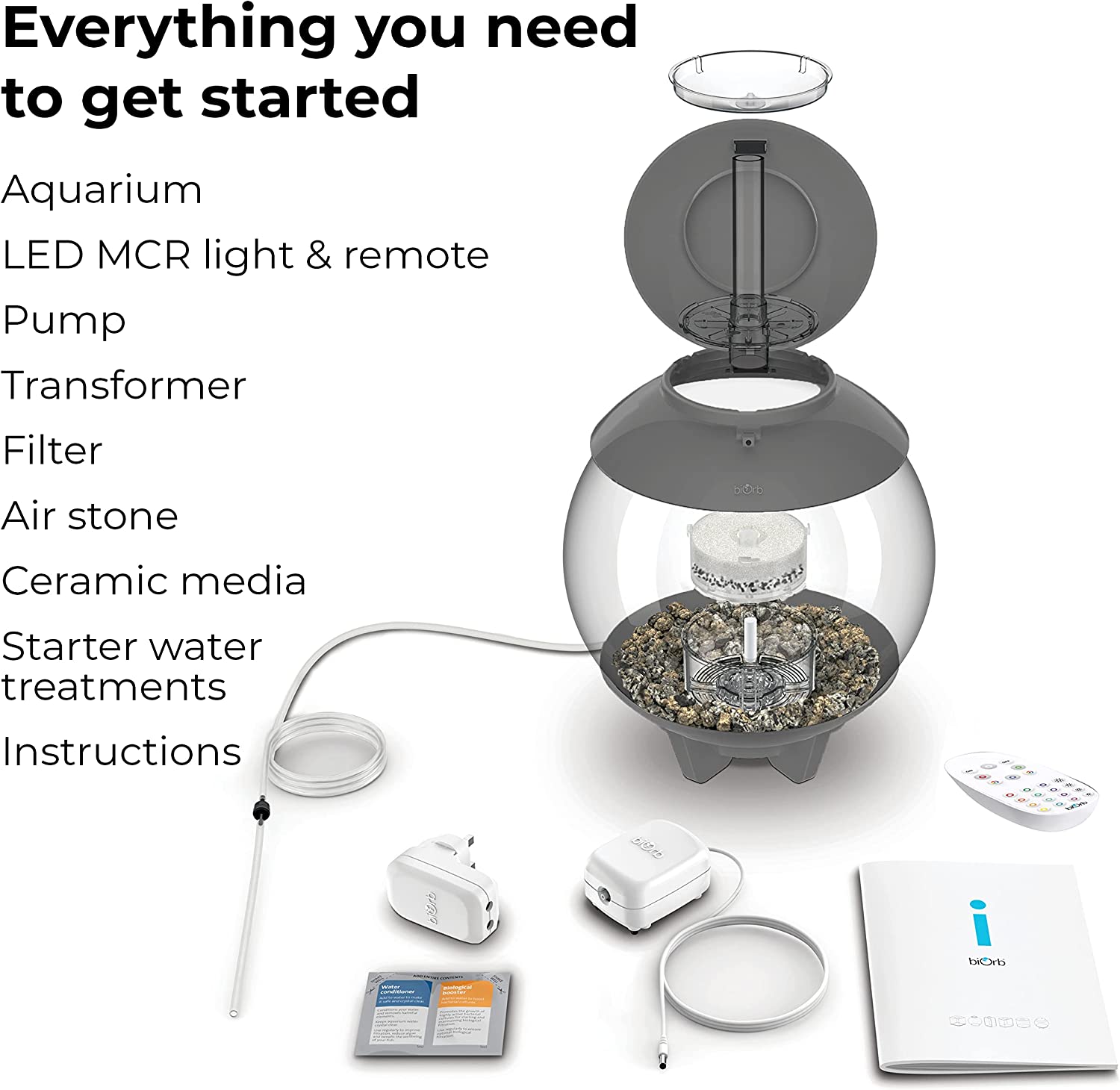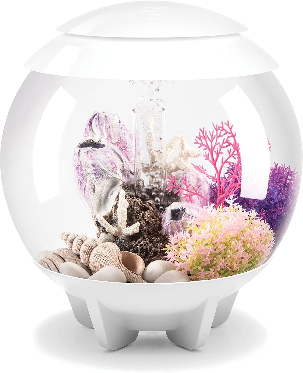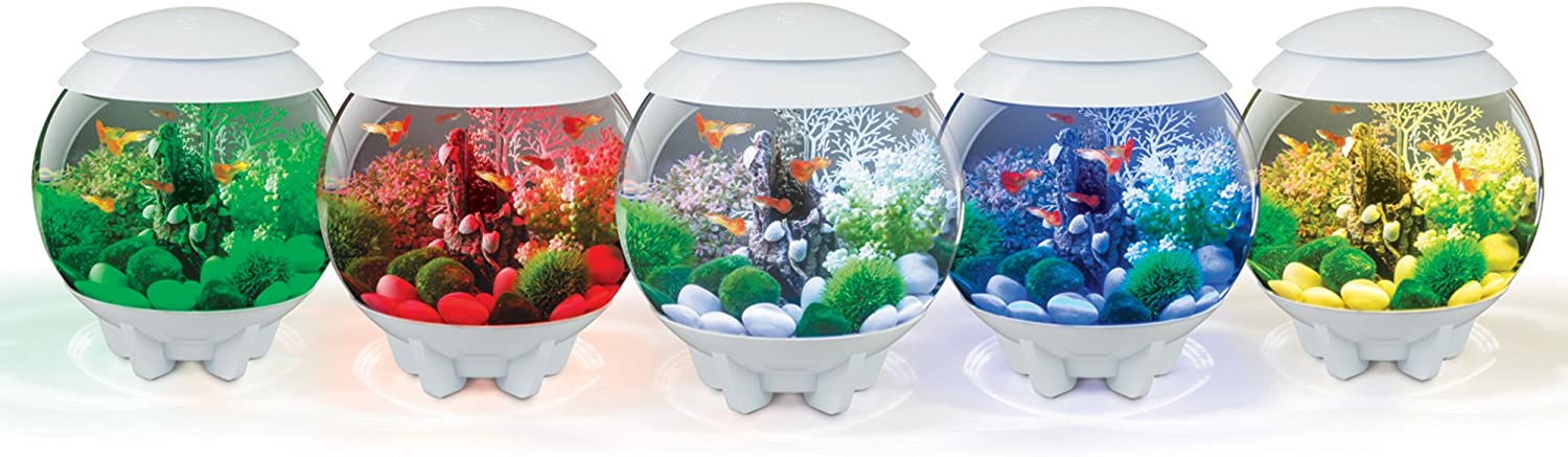 These breathtaking underwater worlds add a sense of joy and wonder to your home. With chic and minimalist design, a biOrb HALO 15 MCR aquarium makes it effortless for you to elevate any space. This 4-Gallon acrylic aquarium is inspired by the simple beauty of a classic fishbowl, but with a twist. The hidden water line and 360-degree view gives the appearance your underwater world is floating in your room. This biOrb HALO has a white lid and base. The layered design of the lid and bold base makes this aquarium truly unique. Everything you need to start your new hobby is included: low voltage pump, LED Multi-color Remote-controlled (MCR) lighting, filtration, and manual. All biOrb aquariums are made from acrylic, which is 10 times stronger and 23% clearer than glass. Acrylic is also a good insulator, so you don't lose as much heat as you would with a glass aquarium. The MCR light will change how you experience biOrb. Choose from 16 preset colors and control the brightness of the light. There's a setting to suit every mood and add to your sense of well-being. The 5-step Filtration ensures clear, healthy water with biological, mechanical and chemical filtration, water stabilization and oxygenation. Unlike most aquariums, a biOrb's filter is fitted at the bottom of the aquarium, because fish waste sinks. The ceramic media that surrounds the filter provides a large surface area for the growth of beneficial bacteria. With quick and easy set-up, you'll soon be setting your creativity free and decorating your biOrb with the endless combinations of biOrb aquarium decorations (sold separately). Additionally, biOrb aquariums are designed for easy maintenance and easy access to feed your fish. Depending on your choice of fish species, you may only need around 15 minutes of maintenance per month using the biOrb Service Kit (sold separately). The aquarium is backed by a 2-year warranty. Enjoy the priceless gift of nature's wonder in your home with biOrb.