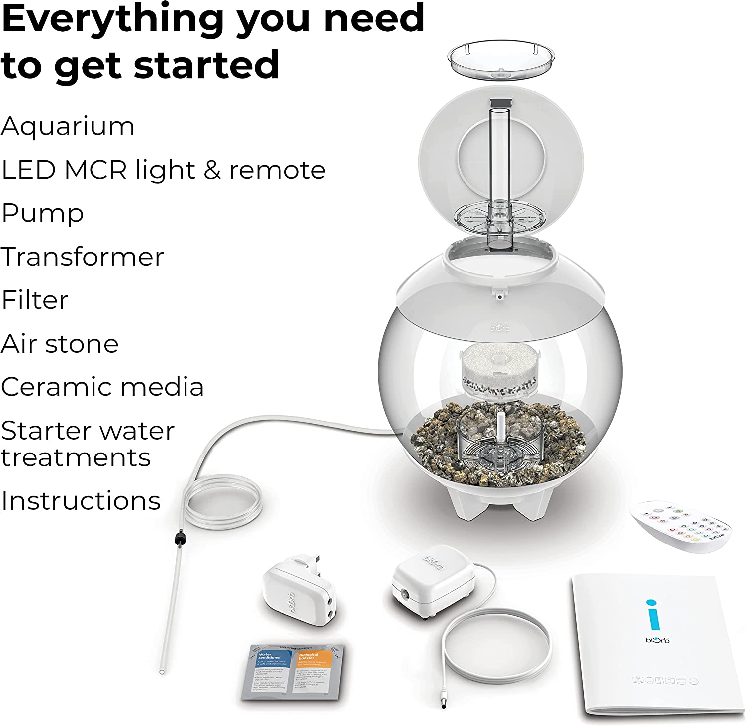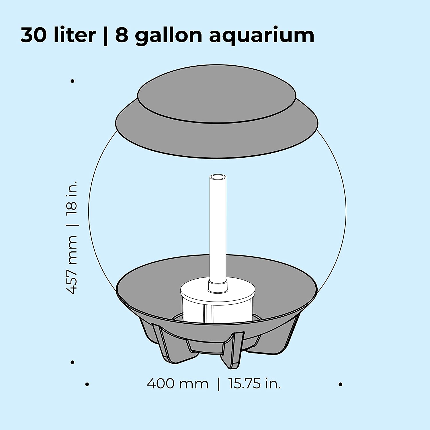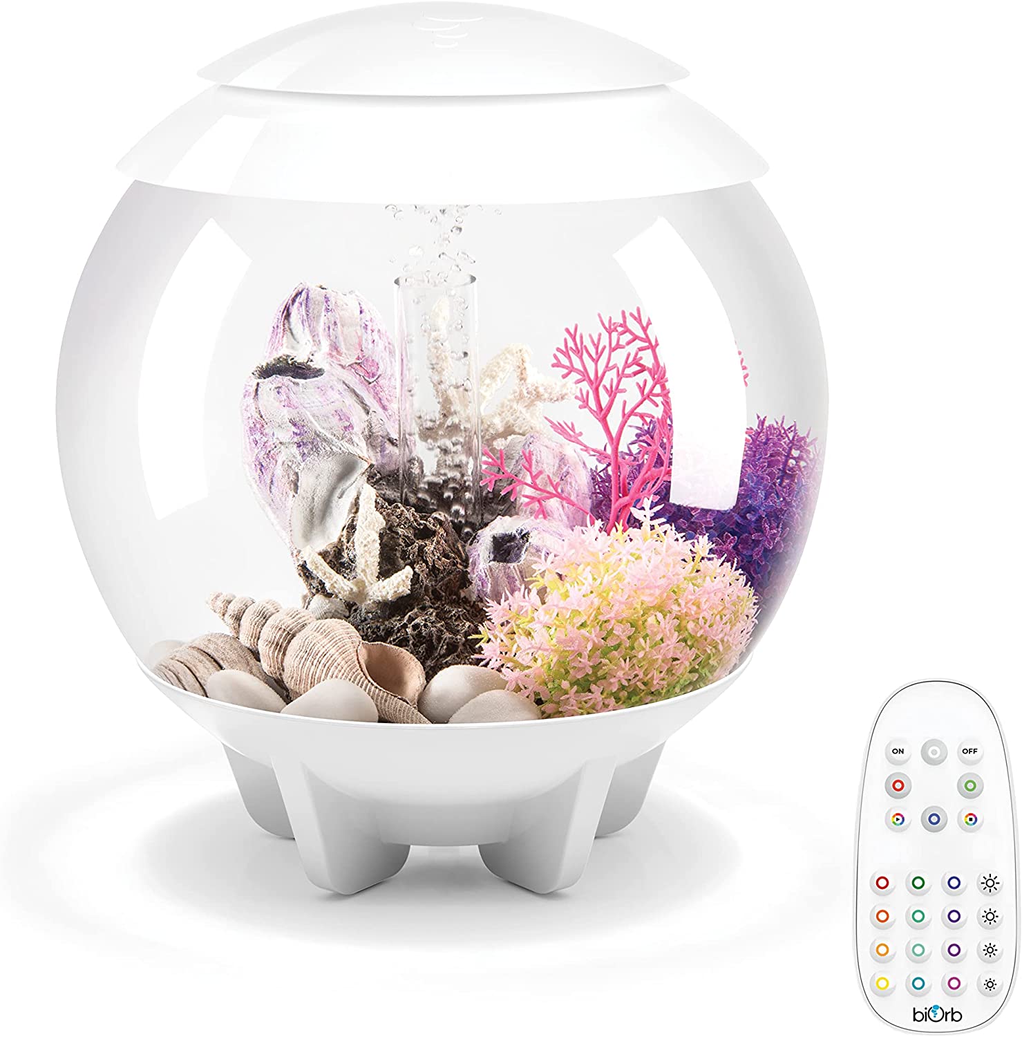 These breathtaking underwater worlds add a sense of joy and wonder to your home. With chic and minimalist design, a biOrb HALO 15 MCR aquarium makes it effortless for you to elevate any space. This 4-Gallon acrylic aquarium is inspired by the simple beauty of a classic fishbowl, but with a twist. The hidden water line and 360-degree view gives the appearance your underwater world is floating in your room. This biOrb HALO has a grey lid and base. The layered design of the lid and bold base makes this aquarium truly unique. Everything you need to start your new hobby is included: low voltage pump, LED Multi-color Remote-controlled (MCR) lighting, filtration, and manual. All biOrb aquariums are made from acrylic, which is 10 times stronger and 23% clearer than glass. Acrylic is also a good insulator, so you don't lose as much heat as you would with a glass aquarium. The MCR light will change how you experience biOrb. Choose from 16 preset colors and control the brightness of the light. There's a setting to suit every mood and add to your sense of well-being. The 5-step Filtration ensures clear, healthy water with biological, mechanical and chemical filtration, water stabilization and oxygenation. Unlike most aquariums, a biOrb's filter is fitted at the bottom of the aquarium, because fish waste sinks. The ceramic media that surrounds the filter provides a large surface area for the growth of beneficial bacteria. With quick and easy set-up, you'll soon be setting your creativity free and decorating your biOrb with the endless combinations of biOrb aquarium decorations (sold separately). Additionally, biOrb aquariums are designed for easy maintenance and easy access to feed your fish. Depending on your choice of fish species, you may only need around 15 minutes of maintenance per month using the biOrb Service Kit (sold separately). The aquarium is backed by a 2-year warranty. Enjoy the priceless gift of nature's wonder in your home with biOrb.
