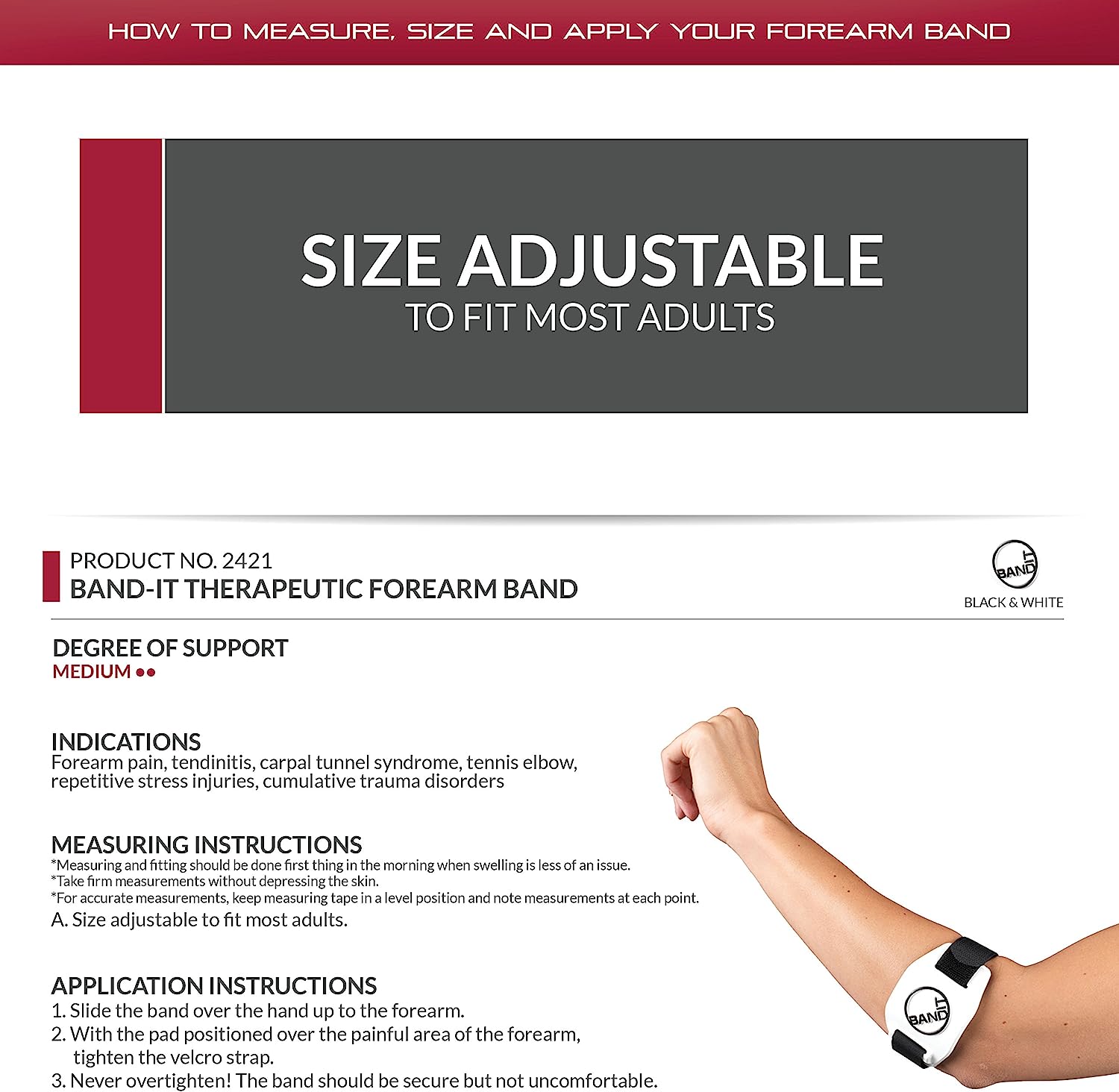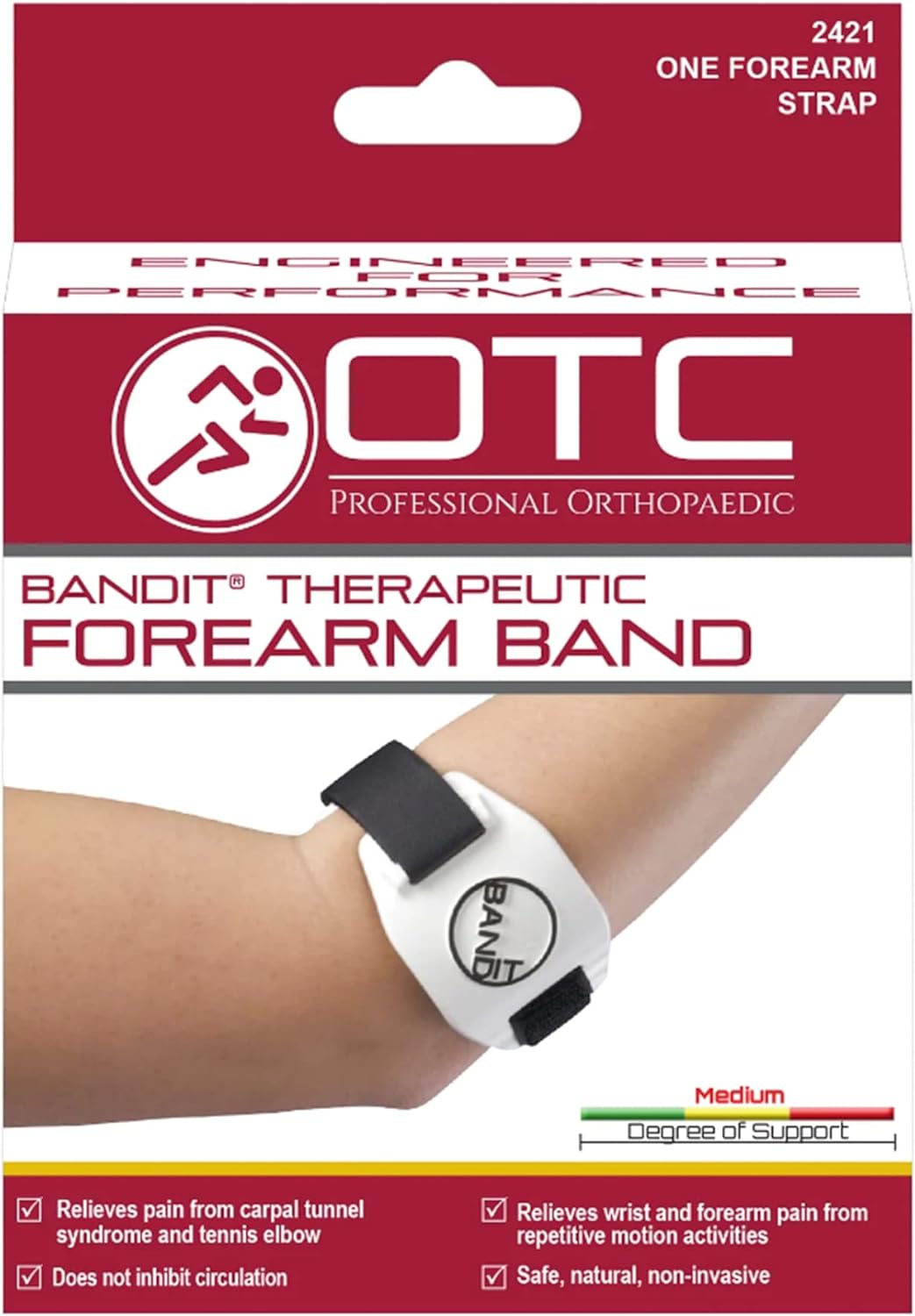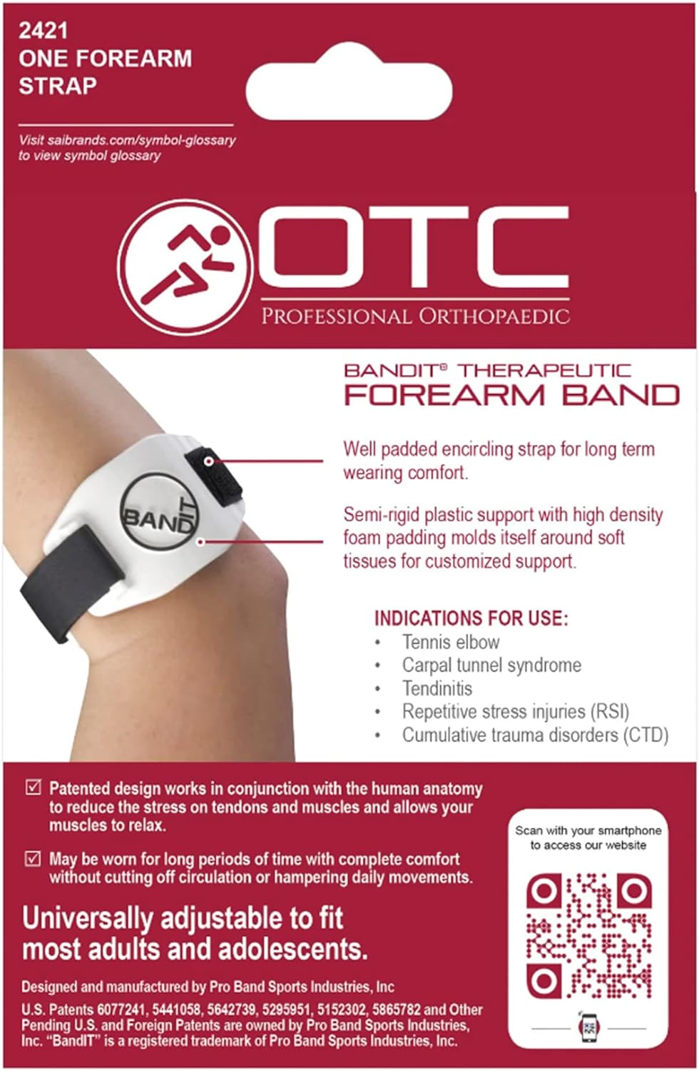 OTC brand (model 2421) band-it forearm band. A safe, natural, non-invasive low cost stimulant which helps the body heal itself of minor discomfort. When worn as directed, BandIT's patented design works in conjunction with the human anatomy to reduce the stress on tendons and muscles and allows your muscles to relax. It may be worn for long periods of time with complete comfort without cutting off circulation or hampering your daily movements. One size fits most arms, right or left.