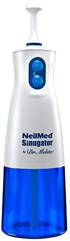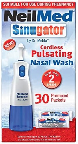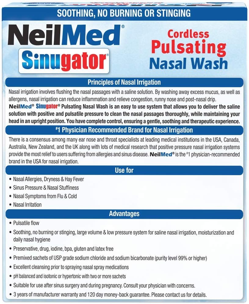 Sinugator cordless pulsating nasal wash used for post nasal drip, nasal dryness from occupational and house dust, fumes, animal dander, grass, pollen and smoke. Soothing, no burning or stinging, large volume and low pressure system for saline nasal irrigation, moisturization and daily nasal hygiene.