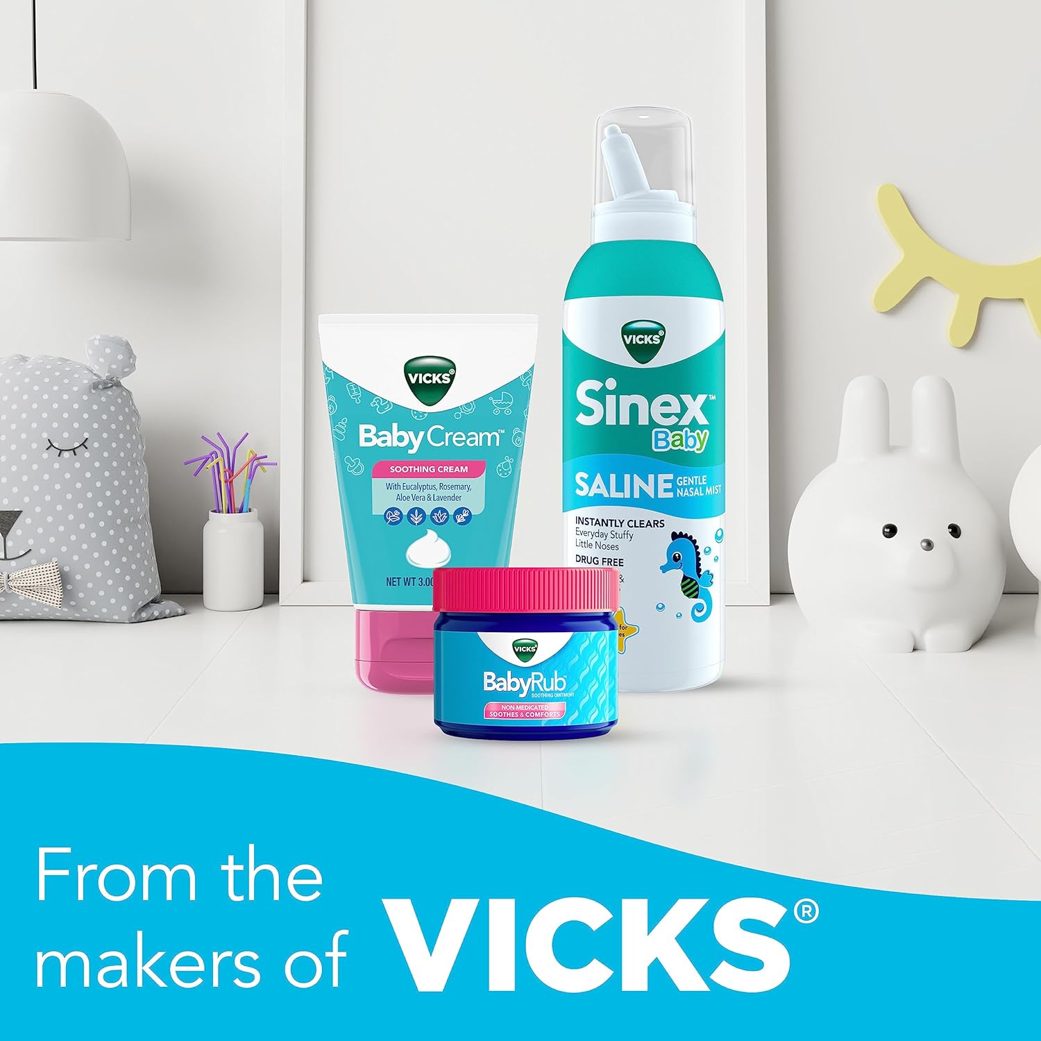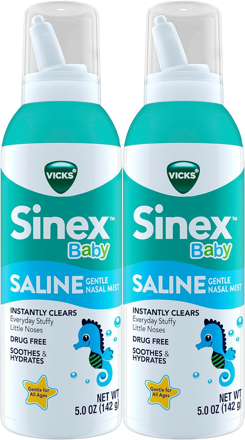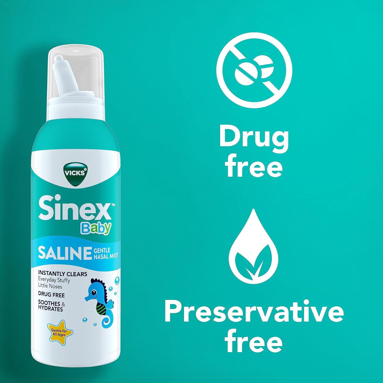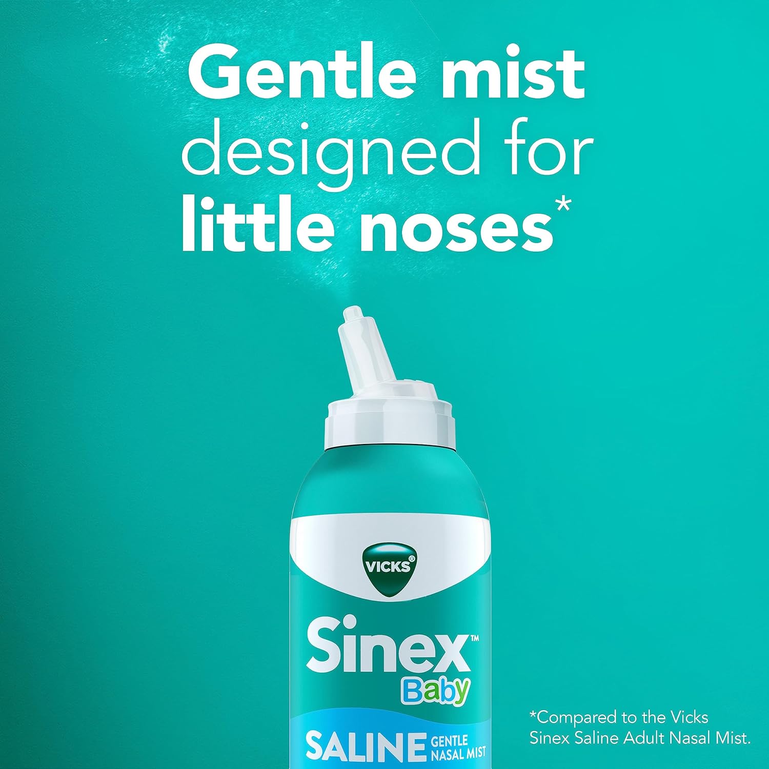 Now specially formulated for babies, relief you can trust from Vicks, the world's #1 selling cough and cold brand! Trusted by families for over 125 years! Vicks Sinex, the brand your nose knows and loves, now makes a drug-free saline spray that is gentle enough for all ages! When your baby needs fast relief, trust Sinex. Instantly clear everyday stuffy little noses with Vicks Sinex Baby Nasal Mist saline spray. It soothes and hydrates dry notrils or nasal passages. Safe and gentle for babies because it is drug-free and sterile with no added preservatives. Its special unltra fine mist spray is designed to deliver gentle yet effective relief. Can be used daily, as often as needed, to treat sinus congestion. Vicks Sinex Baby Saline Spray is safe to use with OTC or prescription medications. Sinex baby is easy to use and mess-free. Simply spray in each nostril and aspirate as needed to clear your baby's everyday congestion.