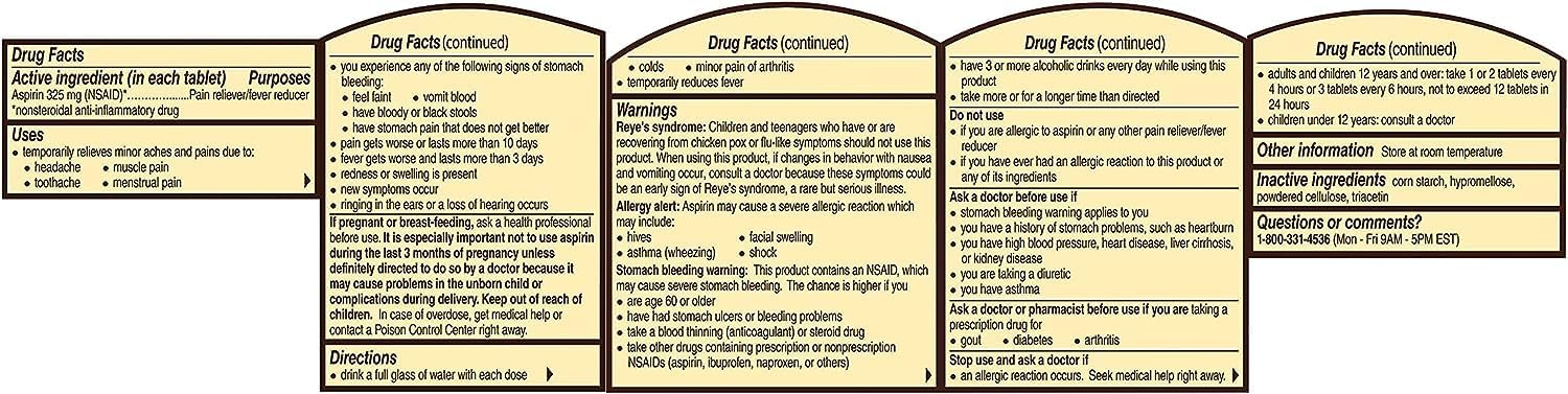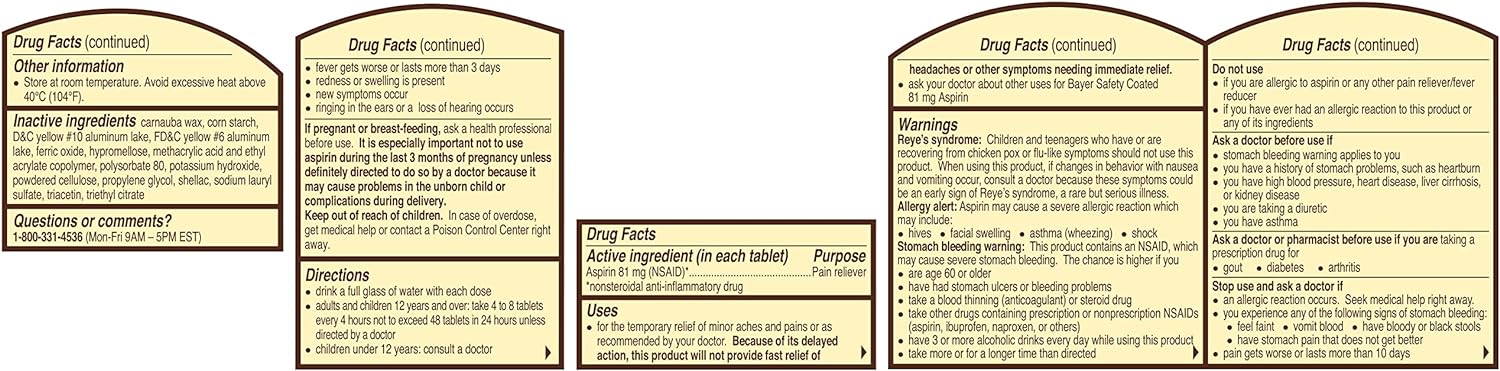 One 300 count bottle of Bayer Aspirin 81mg enteric coated tablets and 2 count pack of Genuine Bayer Aspirin 325mg coated tablets. Protect your heart: Bayer Aspirin helps prevent another heart attack or clot-related (ischemic) stroke when taken as directed by your doctor. The #1 Doctor Cardiologist Pharmacist Recommended: Bayer Aspirin is the #1 Doctor Cardiologist Pharmacist recommended aspirin brand