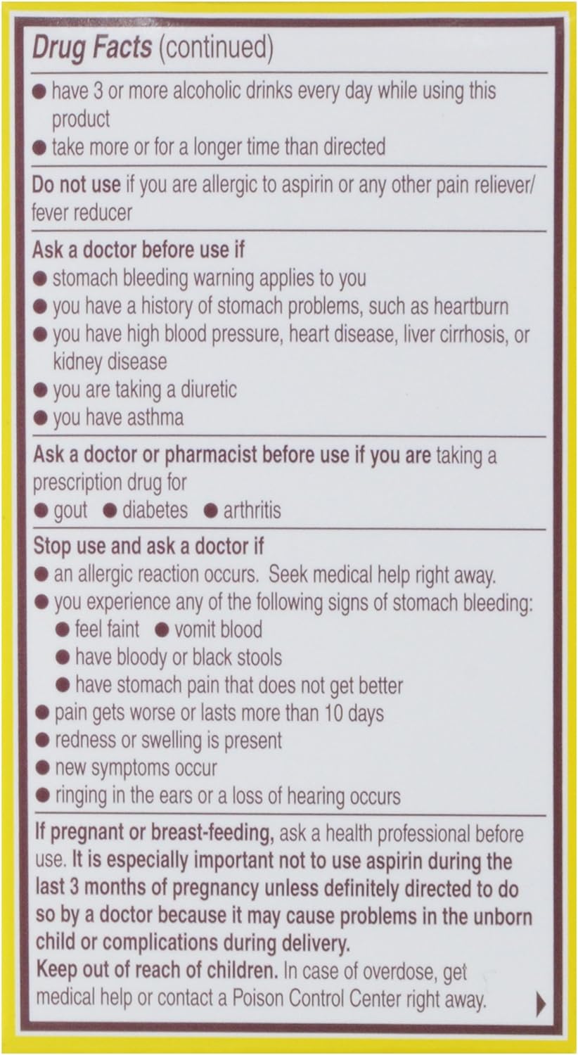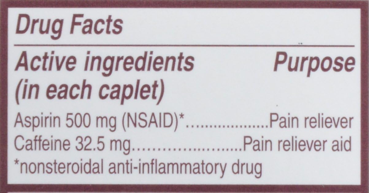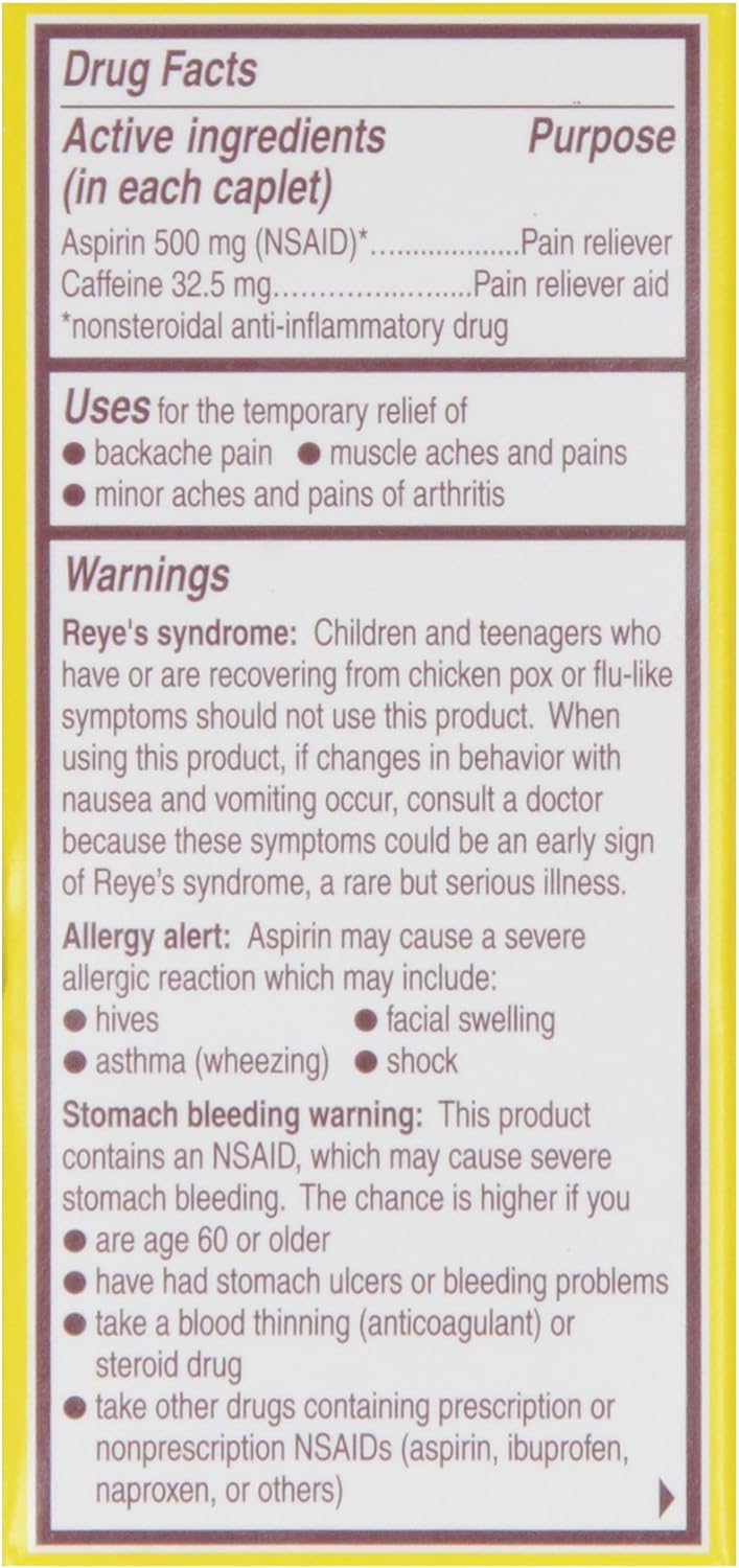 Bayer Back & Body pain reliever has a dual action formula, containing aspirin and a pain relief booster to provide fast relief at the site of pain. Each coated caplet, Provides fast, safe, proven pain relief from backache or muscle aches and pains, Contains caffeine to help boost the pain-relieving effects of aspirin, Is sodium-free, Is coated to make it easier to swallow.