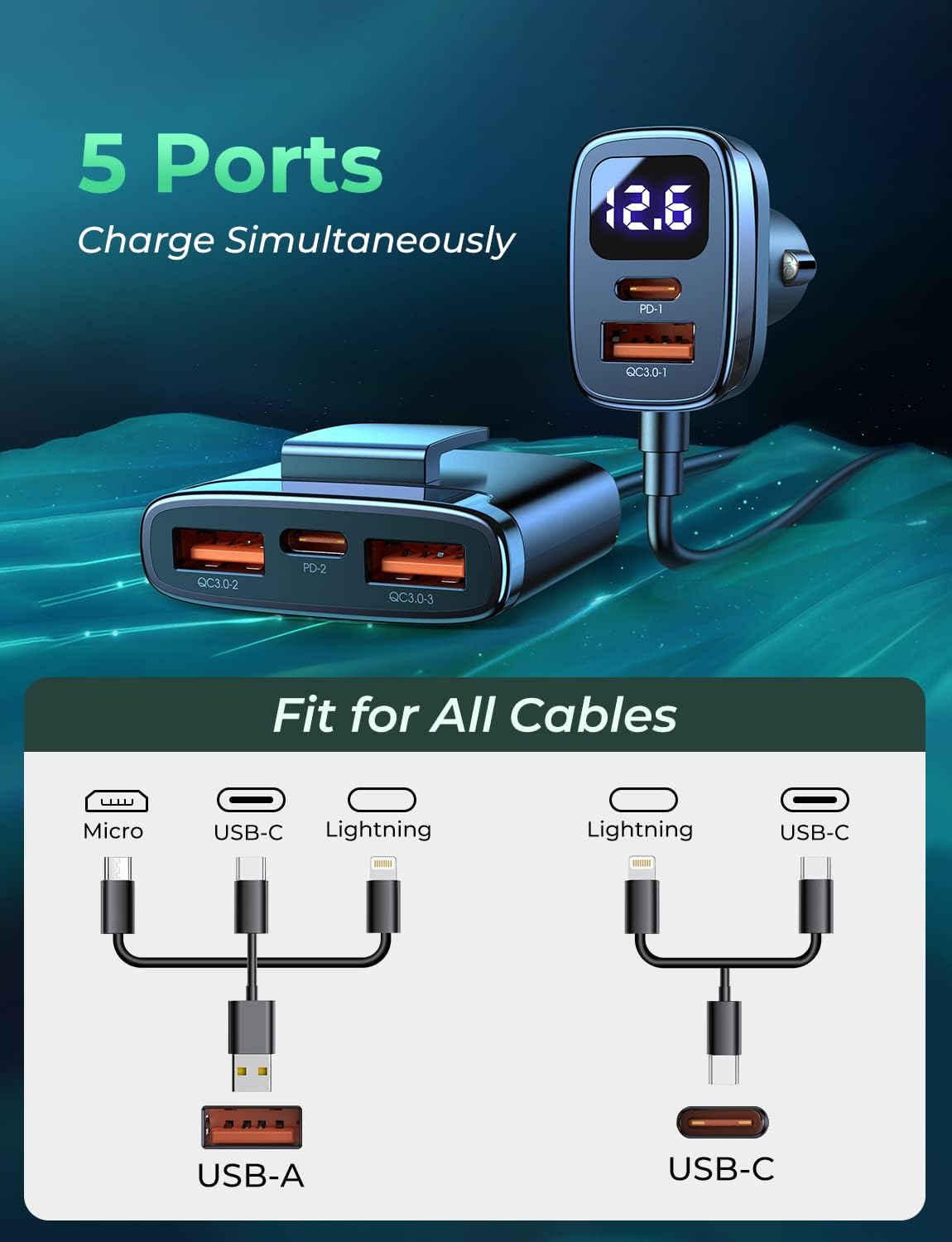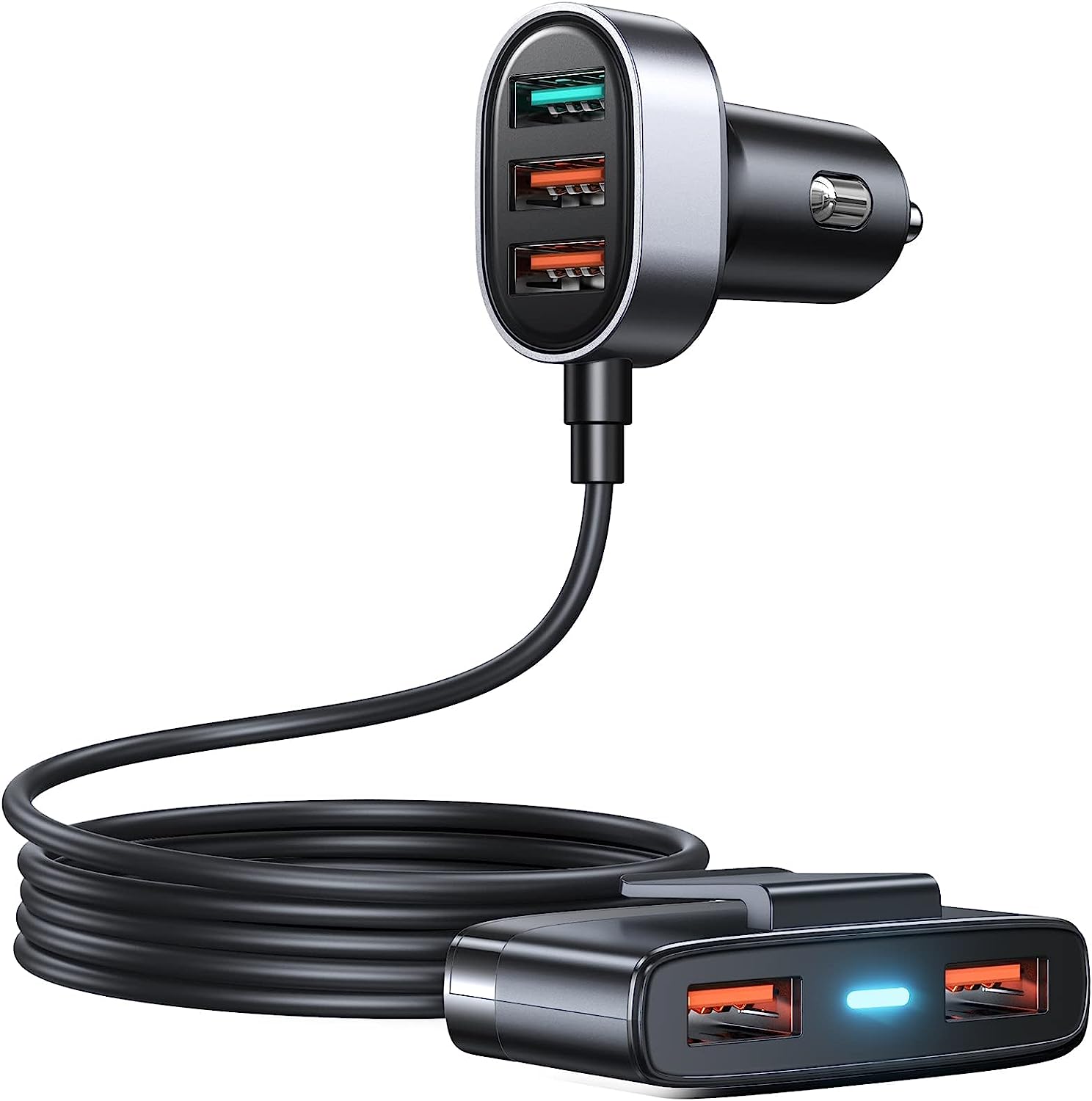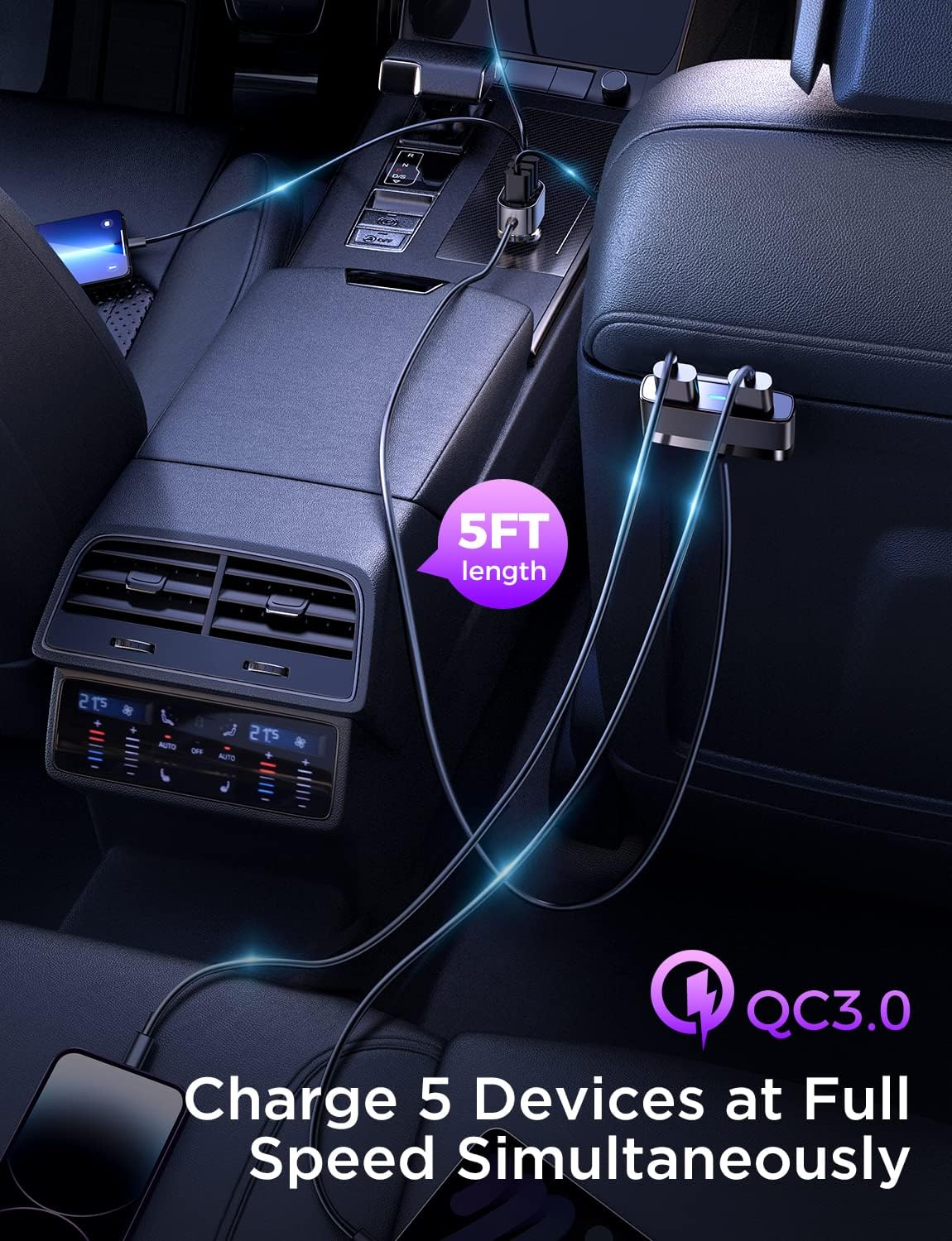 5 Multi USB Car Charger, Car Charger Adapter, USB Car Charger for Multiple Devices, 12V USB Charger Multi Port, Car Charger Cigarette Lighter Adapter USB Charger with 5FT Cable for Back Seat Charging