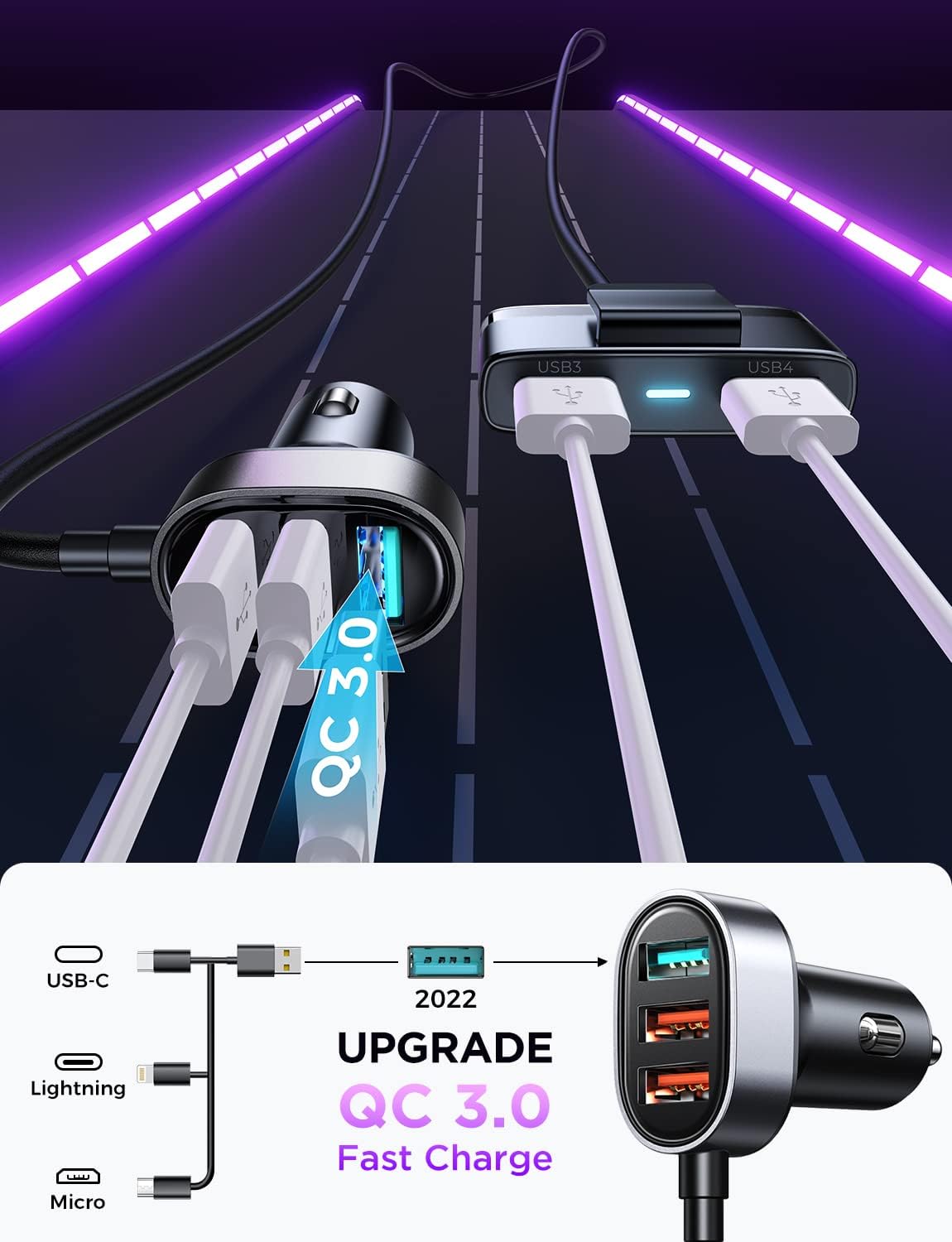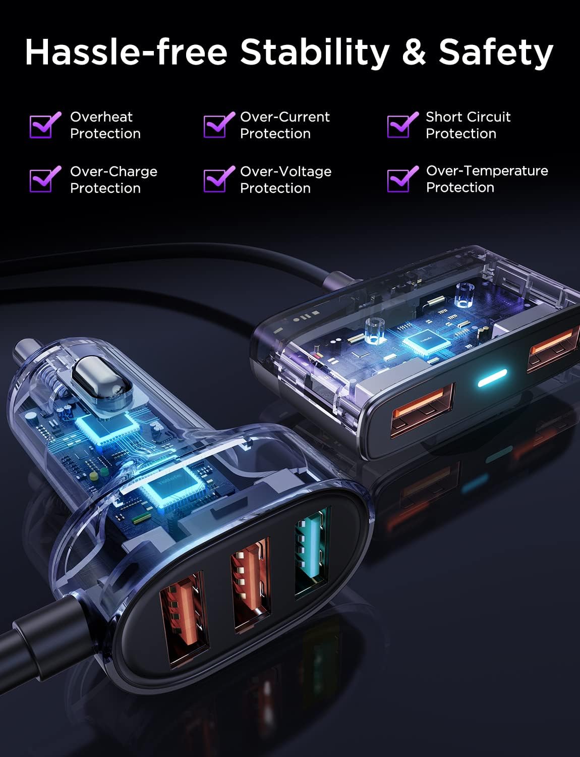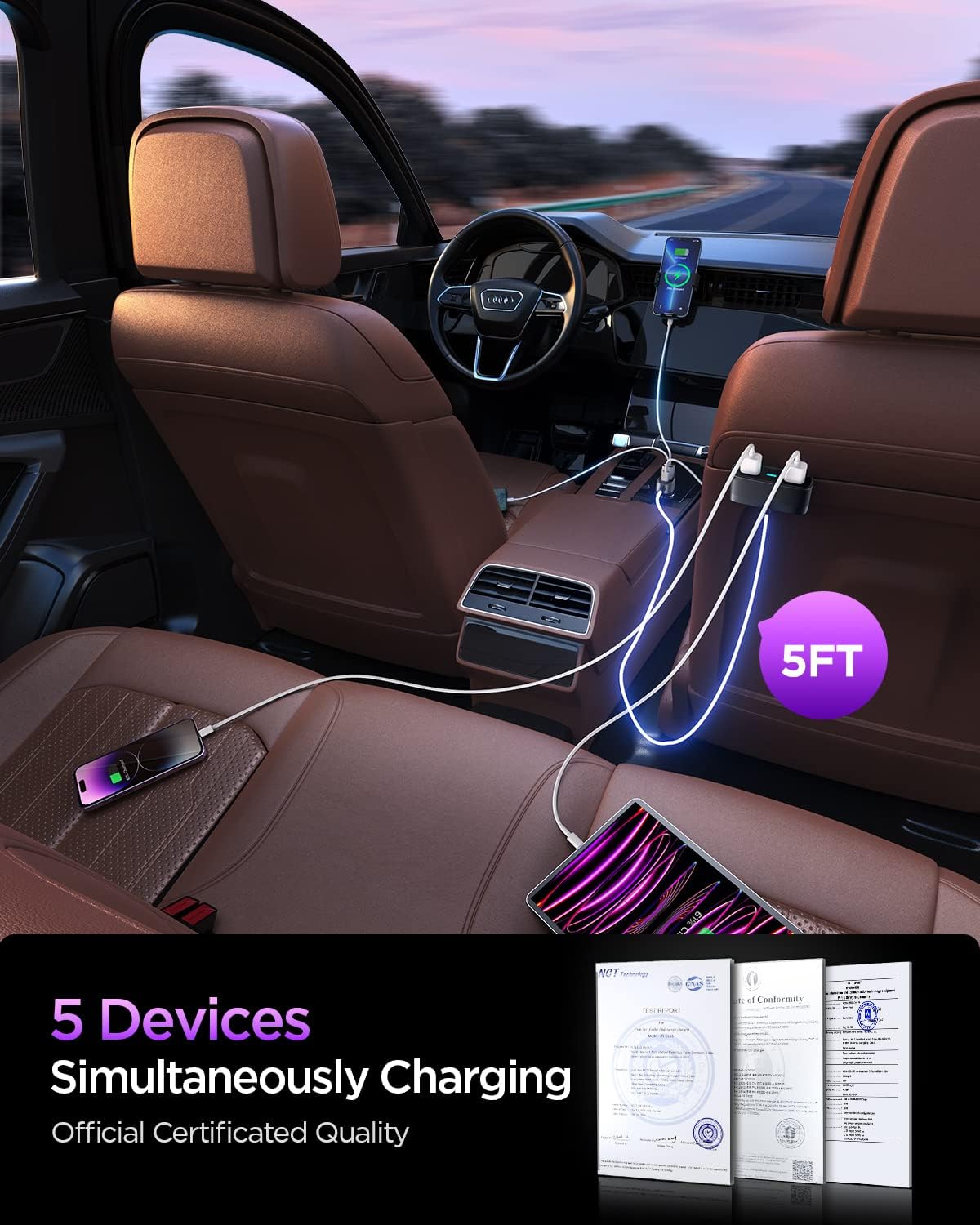 5 Multi USB Car Charger, Car Charger Adapter, USB Car Charger for Multiple Devices, 12V USB Charger Multi Port, Car Charger Cigarette Lighter Adapter USB Charger with 5FT Cable for Back Seat Charging