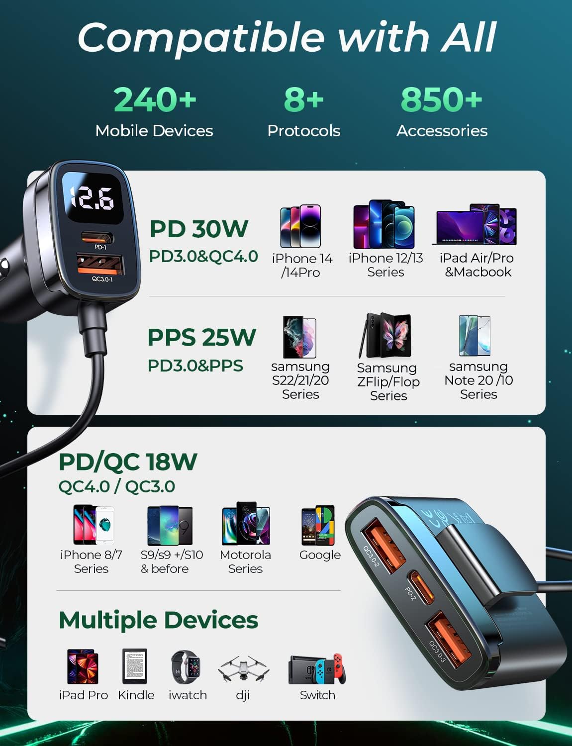 • 📱Universal Compatibility: Compatible with all QC enabled electronic devices, car charger for iPhone&Android phones, iOS&Windows tablets, power banks, video game controllers, sports watch, cameras, and other USB-powered devices. Universal for 12-24V vehicles adapts to mainstream vehicle types such as cars, SUVs, trucks, and off-road.