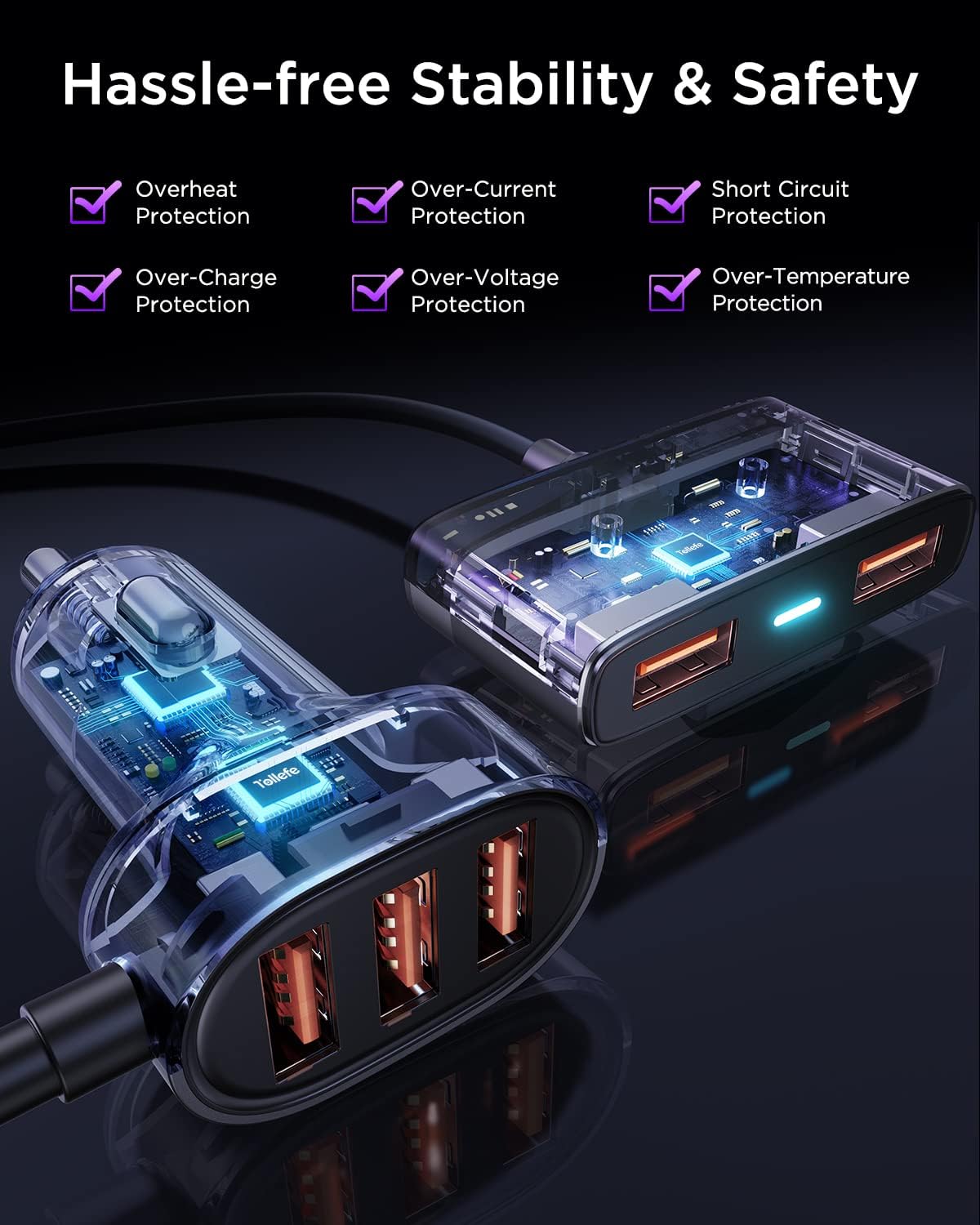 • 🎁Traveling & Family Car Charger: Tollefe 5 multi-port car charger designed for multi-charging needs USB port for car. 3 cigarette lighter USB for driver seat passengers, 2 car charging ports for rear seat passengers. The 5 FT durable extension cable design, allows all passengers could charge their electronic devices simultaneously. Get one for your upcoming family trip or give it as a decent gift for someone you care about.