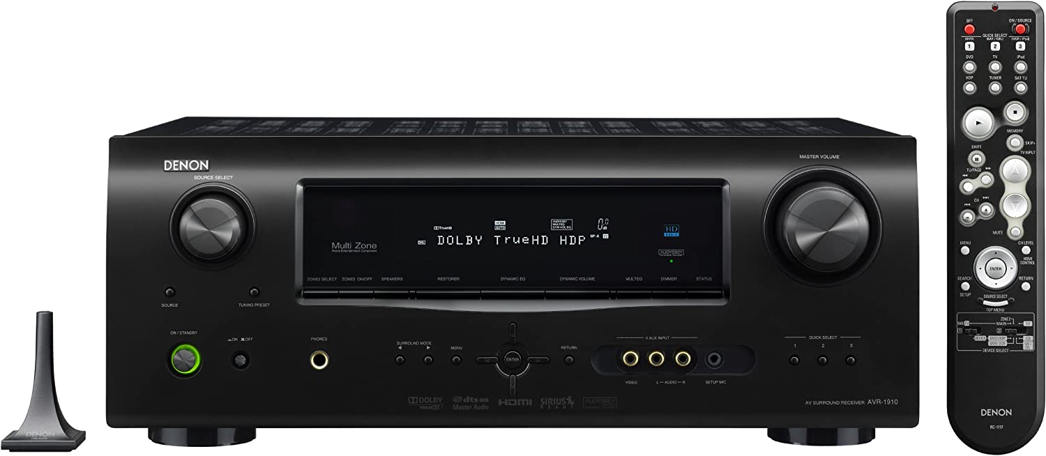 AVR 1910 is packed with technology and features making it the clear choice for value oriented consumers looking for exceptional performance. Each of its 7 amplifier channels produce 90 watts of power, delivering detail and dynamics to music and movie soundtracks. They can be configured for 7.1 channel surround sound, or drive a 5.1 channel system in the main room and power a pair of speakers in a second “zone”. It’s equipped with 1080p compatible HDMI 1.3a Repeating technology, delivering both audio and video to your HDTV with single HDMI cable. This HDMI connectivity supports the latest generation surround sound formats available on Blu ray disc, including Dolby TrueHD and DD+, dts HD and dts HR. Also included is Dolby Laboratories new Pro Logic IIz Matrix decoding featuring front height effects channels that expands front soundstage. The AVR1910 boast a number of Audyssey technologies. Advanced Audyssey MultEQ analyzes a speaker systems interaction with room acoustics, and then delivers custom tailored correction processing to optimize clarity and tonal balance throughout the listening space. Audyssey Dynamic Volume is an automatic volume leveling system that tracks audio dynamics to eliminate the irritating volume swings between TV shows and commercials. Audyssey Dynamic EQ is also on board to ensure rich bass and smooth tonal balance at low volume listening levels. In addition to enhanced HDMI 1.3a repeating (4 in, 1 out), the AVR1910 is the least expensive receiver in the Denon lineup to feature 1080p i/p conversion, analog to HDMI upscaling and HDMI to HDMI scaling. Video conversion is accomplished using a premium Anchor Bay Technologies 1030 chip set featuring 10 bit processing. The AVR1910 also features component video switching (2 in, 1 out), seven analog inputs, and multi zone (2)/multi source (2) capability. A front panel audio/video input allows quick and easy connection of camcorders and game systems.