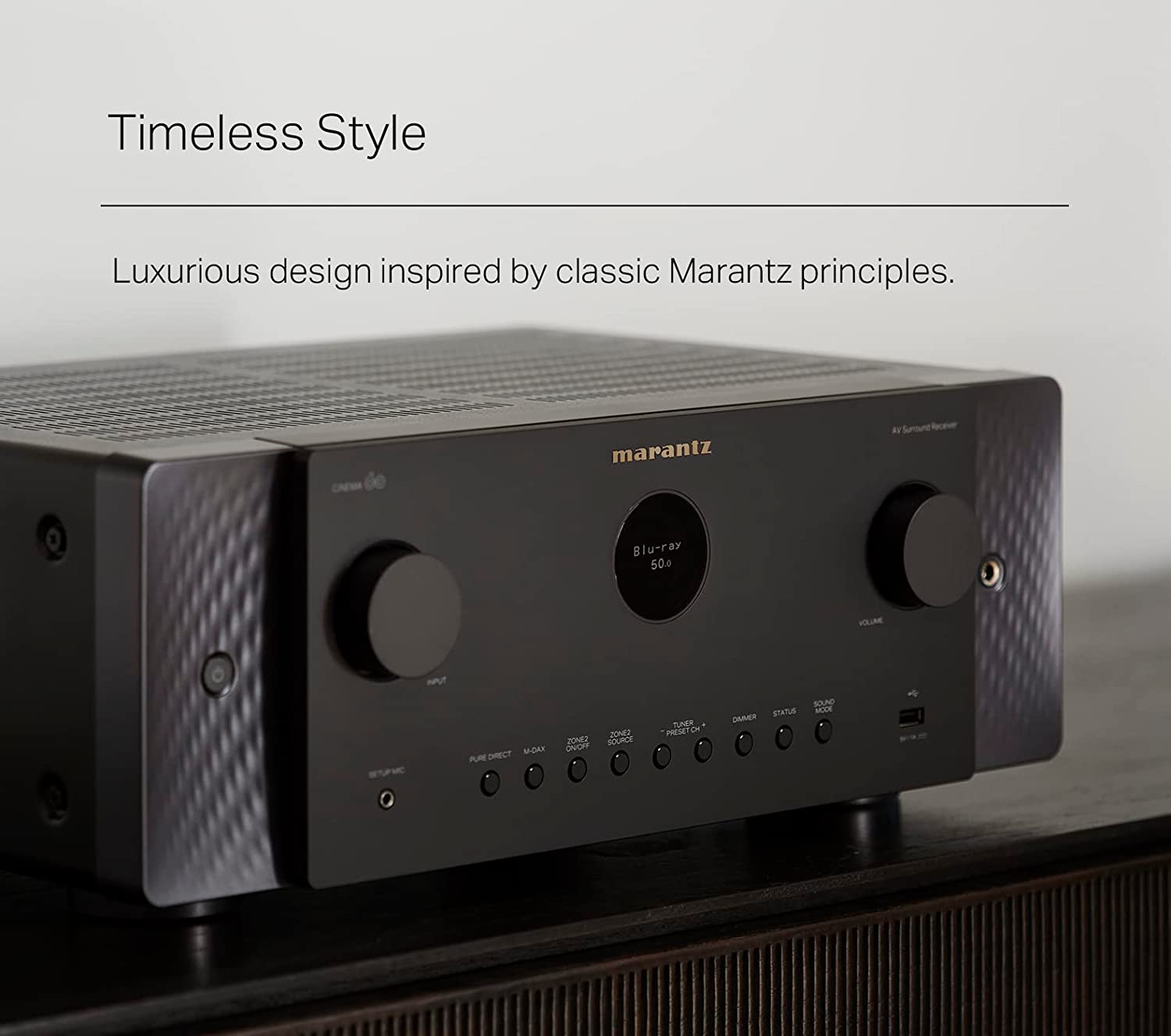 Packed with the latest technologies in sound and video reproduction with theater-like home surround sound entertainment, the Marantz Cinema 60 AV Receiver is the perfect choice for large home theater systems. This home theater receiver has 7.2 channels (100W X 7) along with the legendary HDAM circuitry to drive even the most powerful loudspeakers. You can also stream music from Spotify, Pandora, TuneIn, and many more, via built-in HEOS, WiFi, and Bluetooth for a whole-home audio system. The Cinema 60 comes with (8) HDMI ports (6 In/2 Out) with (3) HDMI inputs having 8K pass-through. The AVR supports the latest video formats like HDR10+, HDR10, Dolby Vision, HLG, and more for an exceptional cinematic experience. Also supports VRR, ALLM, QFT, and more for smooth, lag-free gaming. The Cinema 60 takes your home surround sound system to the next level with Dolby Atmos, DTS:X, Dolby Height Virtualization, and DTS Virtual:X for an immersive surround sound experience. Built upon decades of rich heritage, designed with timeless style, and engineered for utmost performance, Marantz CINEMA Series is the foundation of the world's most demanding home theaters.
