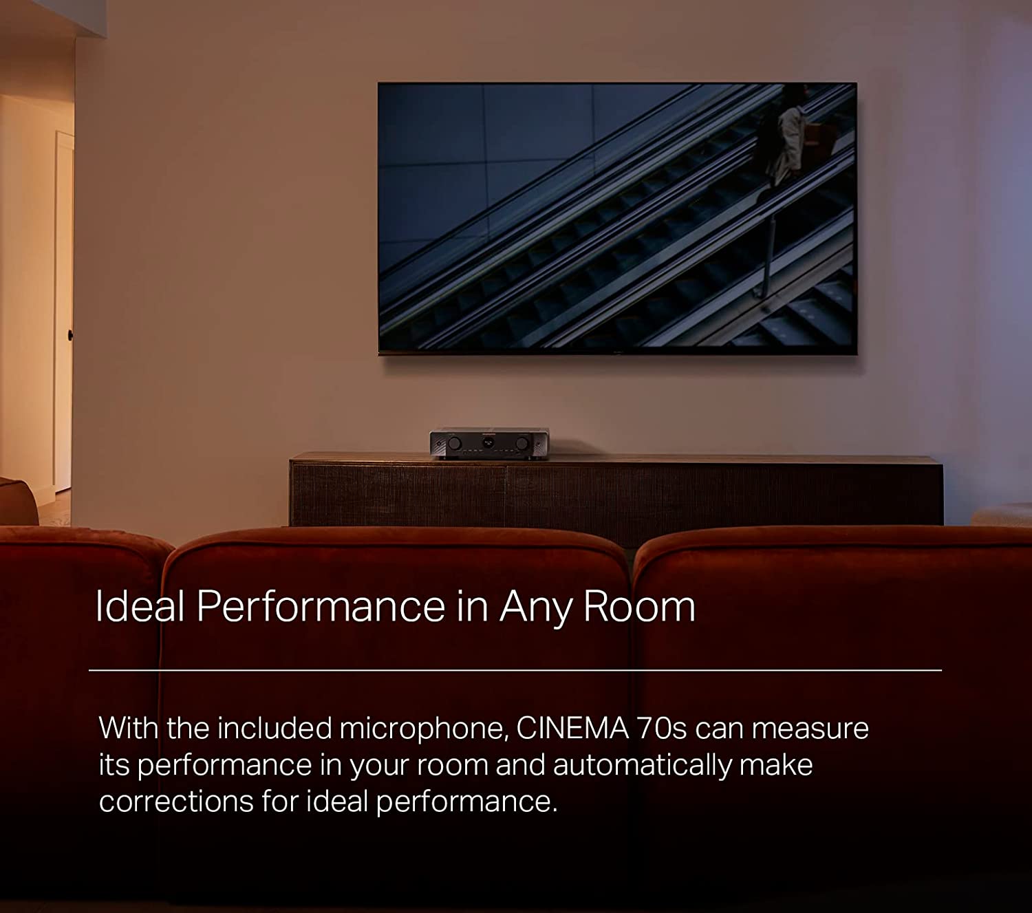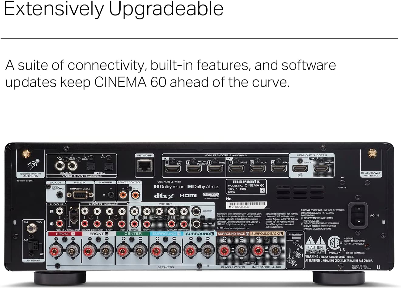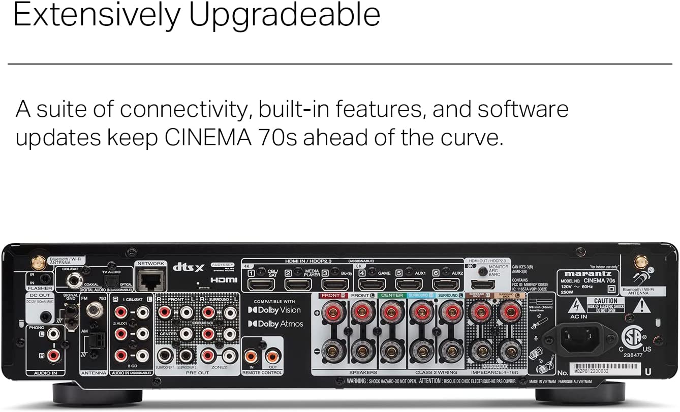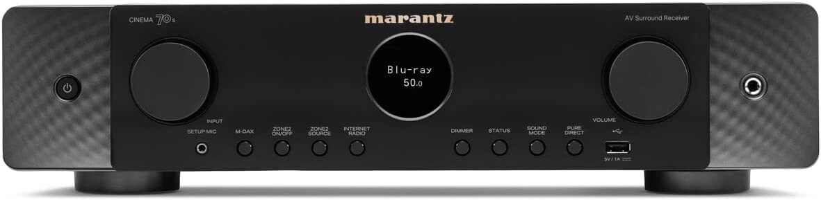 Packed with the latest technologies in sound and video reproduction with theater-like home surround sound entertainment, the slimline Marantz Cinema 70S AV Receiver is the perfect choice for large home theater systems. This home theater receiver has 7.2 channels (50W X 7) along with the legendary HDAM circuitry to drive even the most powerful loudspeakers. You can also stream music from Spotify, Pandora, TuneIn, and many more, via built-in HEOS, WiFi, and Bluetooth for a whole-home audio system. The Cinema 70S comes with (7) HDMI ports (6 In/1 Out) with (3) HDMI inputs having 8K pass-through. The AVR supports the latest video formats like HDR10+, HDR10, Dolby Vision, HLG, and more for an exceptional cinematic experience. Also supports VRR, ALLM, QFT, and more for smooth, lag-free gaming. The Cinema 70S takes your home surround sound system to the next level with Dolby Atmos, DTS:X, Dolby Height Virtualization, and DTS Virtual:X for an immersive surround sound experience. Built upon decades of rich heritage, designed with timeless style, and engineered for utmost performance, Marantz CINEMA Series is the foundation of the world's most demanding home theaters.