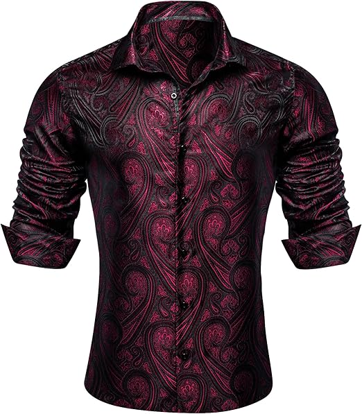 Barry.Wang Men's Dress Shirts Paisley Silk Long Sleeve Button Down Western Cowboy Shirt Wedding Party Woven Floral Tops