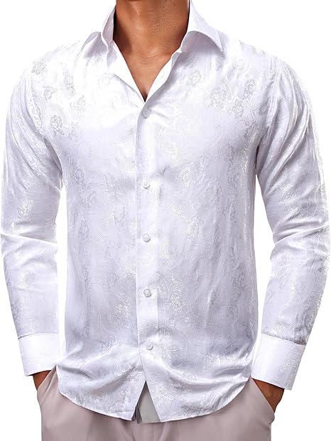 Barry.Wang Men's Dress Shirts Solid Paisley Satin Long Sleeve Casual Formal Silky Shirt for Men Shirts Business Party Wedding