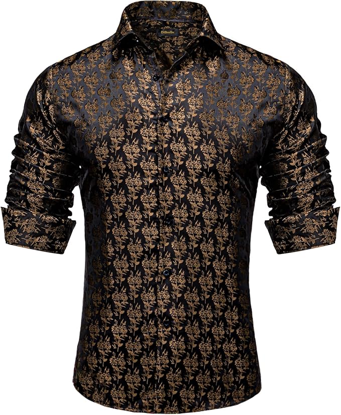 DiBanGu Black Gold Shirt for Men Silk Paisley Mens Dress Shirts Long Sleeve Men's Casual Button-Down Shirts
