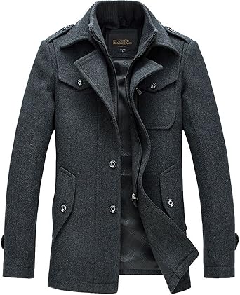 chouyatou Men's Stand Collar Wool-Blend Classic Pea Coat with Removable Inner Collar