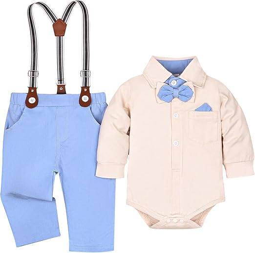 Baby Boy Clothes Gentleman Outfits Infant Bodysuit Long Sleeve Shirt with Bowtie Suspender Pants Suits Set 0-18M