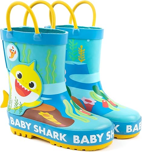 Baby Shark Kids Wellies | Girls & Boys Rain Wellington Boots With 3D Fin | Toddlers Blue Yellow Water Resistant Walking Shoes