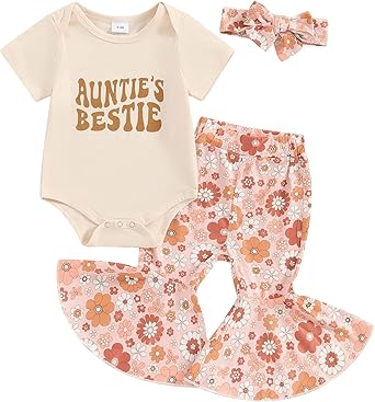 Aunties Bestie Baby Clothes Girl Baby Girl Aunt Saying Letter Romper Shirt Floral Flare Pants Headband 3Pcs Outfit