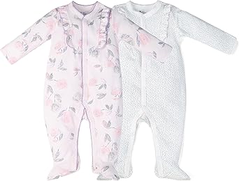 100% Cotton Baby Girls Footies Set of 2, 0-12 Months Long Sleeve Sorf and Comfortable Toddler Girls' Footed
