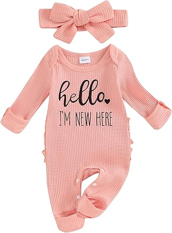 BULINGNA Newborn Baby Girl Coming Home Outfit Hello I'm New Here Ribbed Footie Romper Jumpsuit with Headband Fall Clothes