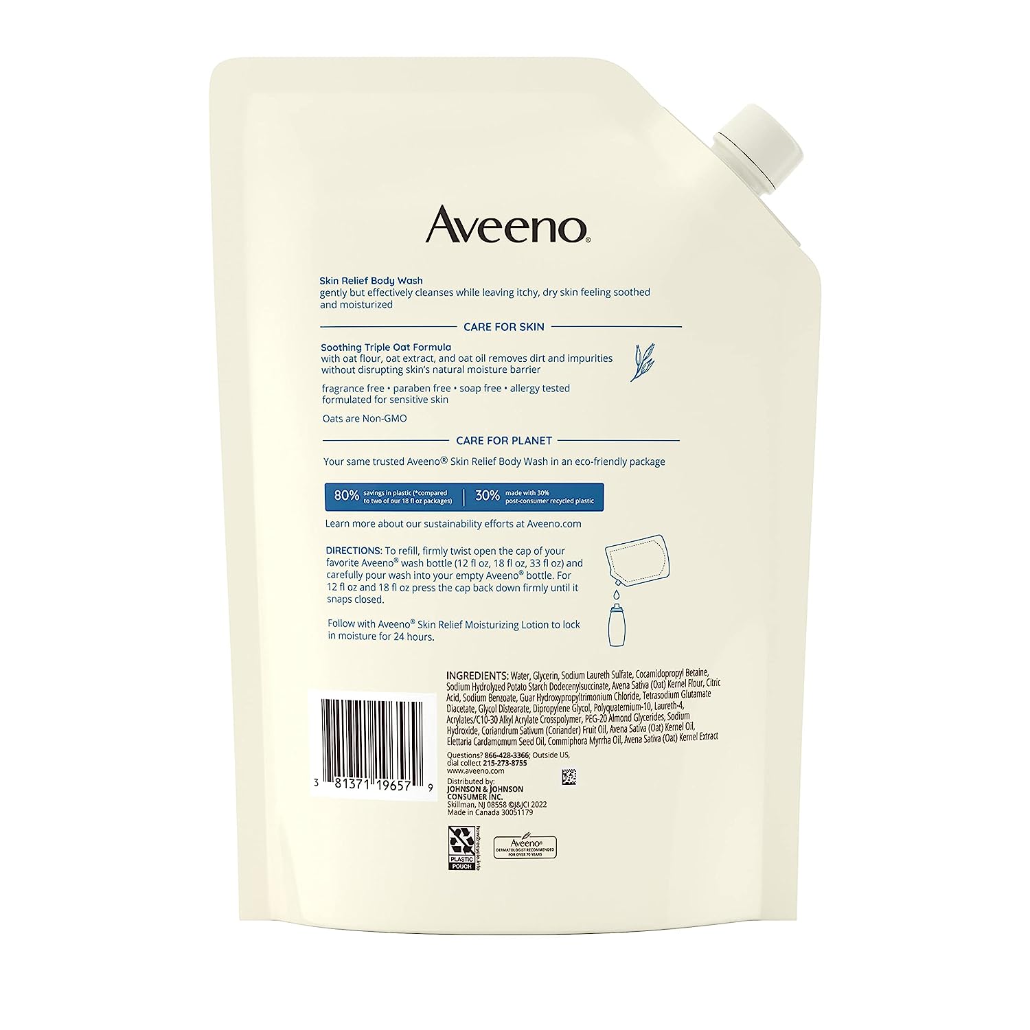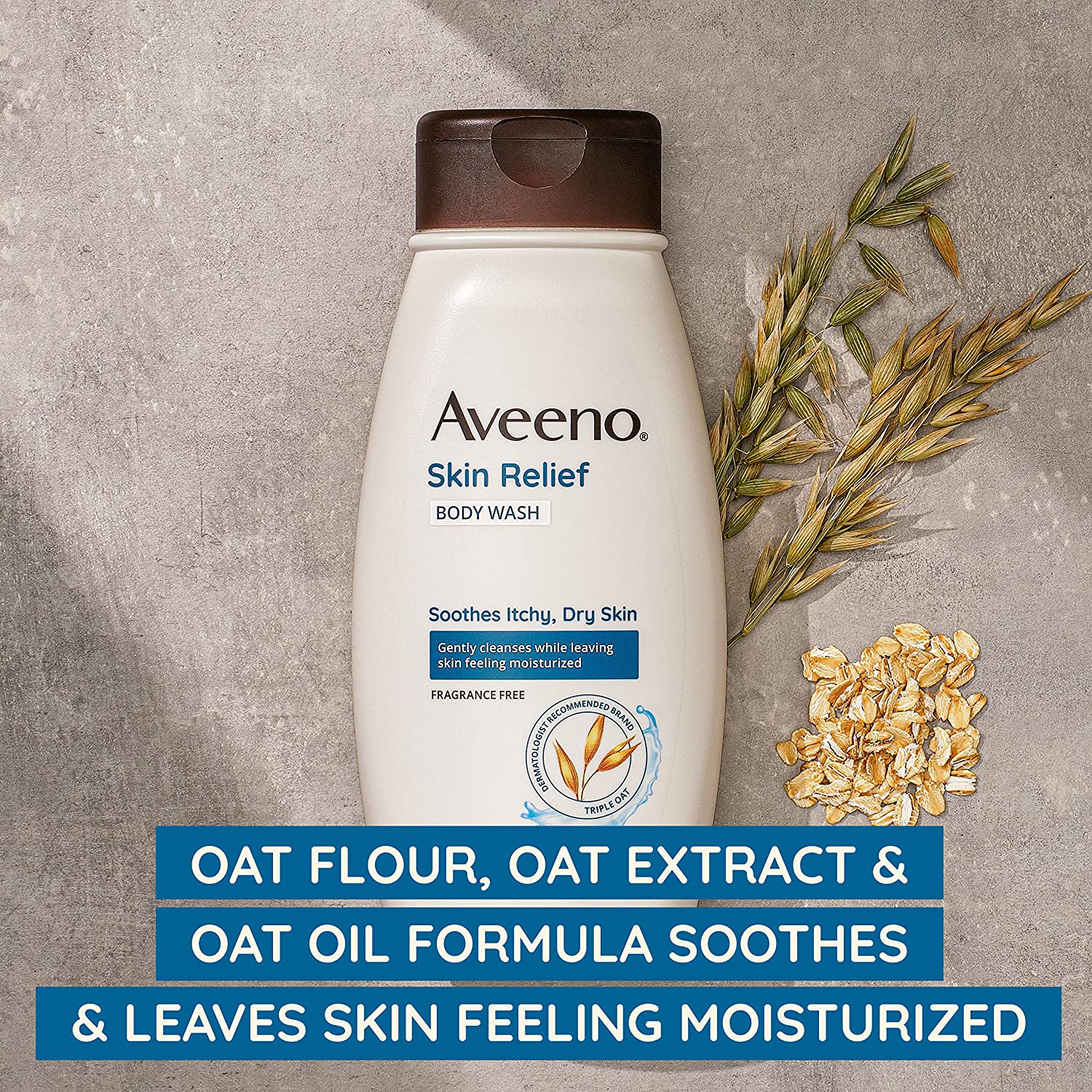 Gently cleanse while leaving skin feeling moisturized with Aveeno Skin Relief Fragrance-Free Body Wash. This fragrance-free body wash is made with a soothing Triple Oat formula and formulated for sensitive skin. Aveeno Skin Relief Body Wash gently, but effectively cleanses while leaving itchy, dry skin feeling soothed and moisturized. The soothing Triple Oat formula with oat flour, oat extract and oat oil removes dirt and impurities without disrupting skin's natural moisture barrier. From the dermatologist-recommended brand for over 70 years, this body wash is allergy-tested, free of fragrances, parabens, dyes and soaps, and is suitable for daily use. To Use, squeeze body wash onto a wet pouf, washcloth or hands. Work into a rich, creamy lather, then rinse. Aveeno uses the goodness of nature and the power of science to keep your skin looking healthy and feeling balanced.