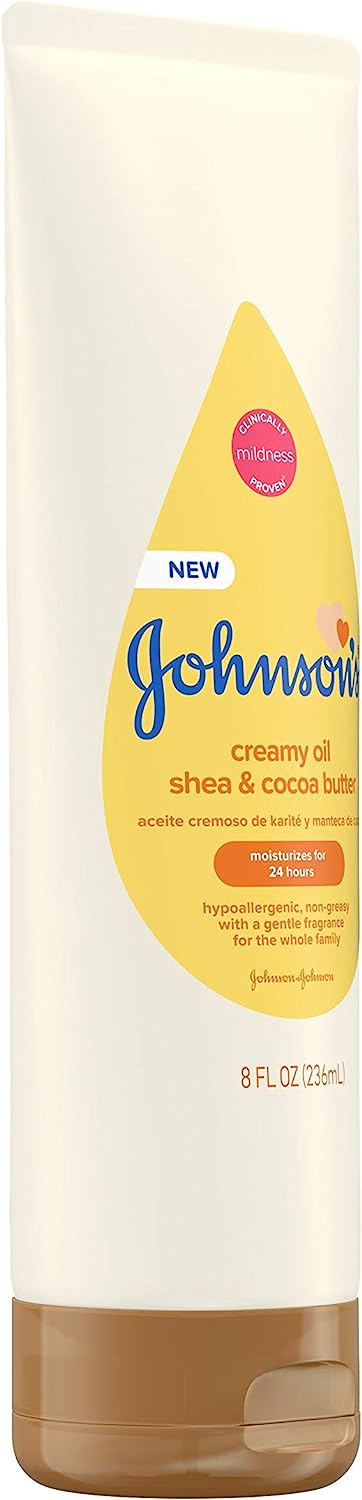 Care for your baby's delicate skin with Johnson's Moisturizing Creamy Oil with Shea & Cocoa Butter. Designed to be gentle and effective for sensitive, this creamy baby oil from a dermatologist- and pediatrician-recommended brand is suitable for daily use on babies, children and adults alike, and moisturizes for a full 24 hours. The moisturizing, clinically proven mild formula with shea and cocoa butter absorbs quickly into skin to relieve dryness, leaving it soft and smooth with a non-greasy feel and a gentle fragrance. Hypoallergenic and tested by dermatologists, the gentle moisturizing baby oil is paraben-, phthalate-, and dye-free. Like all Johnson's products, this creamy oil is designed to meet or exceed the top internationally recognized regulatory standards, making it a safe and effective addition to your family's daily skincare routine.