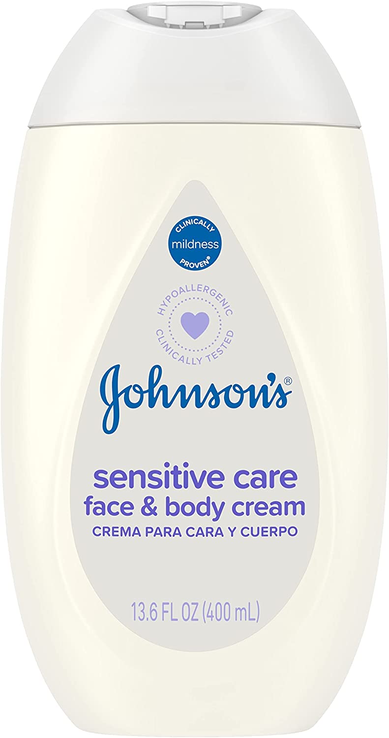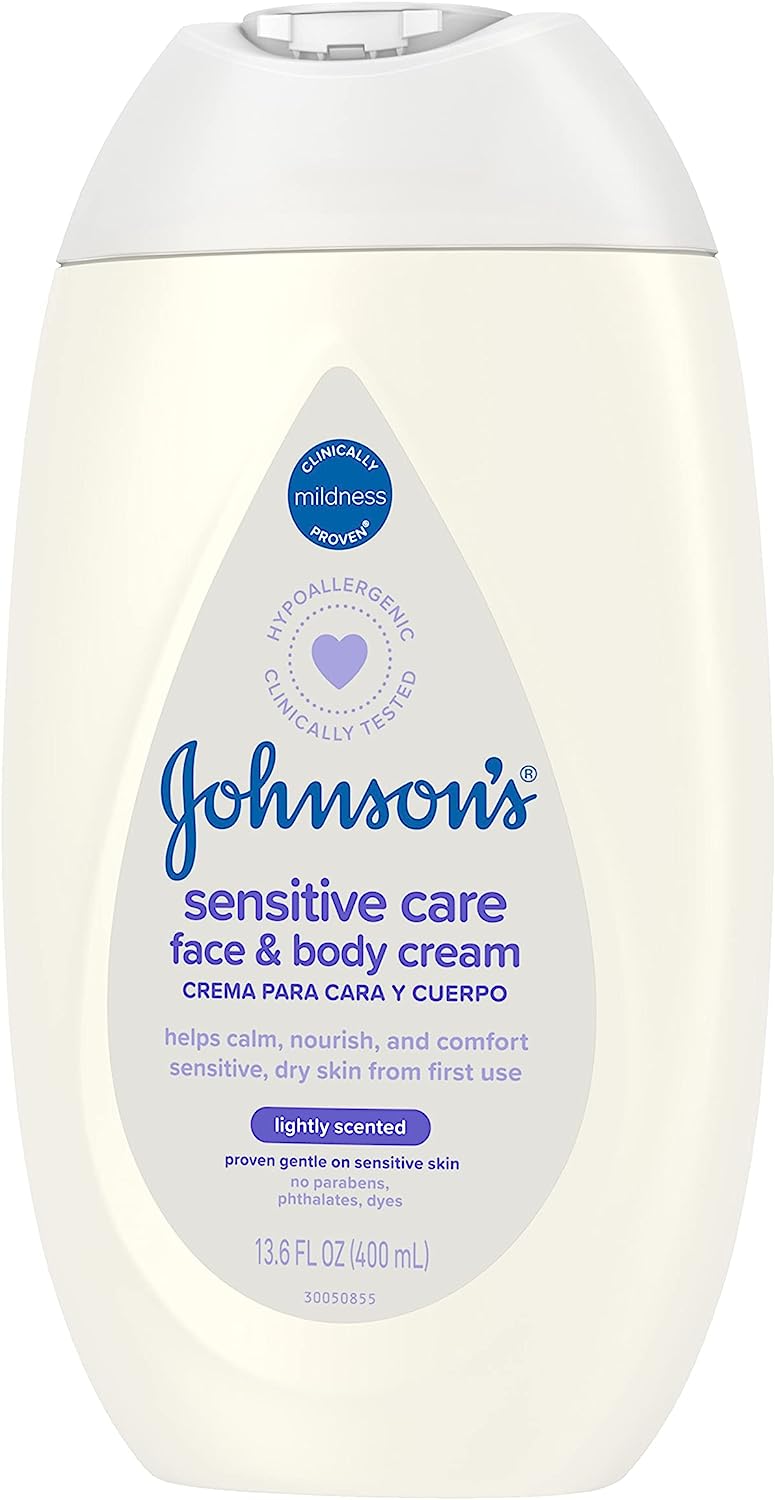 Johnson's Sensitive Care Face & Body Cream for Babies, Daily Moisturizing Baby Cream to Calm, Nourish & Comfort Dry, Sensitive Skin, Lightly Scented, No Greasy Feel, Hypoallergenic, 13.6 fl. oz