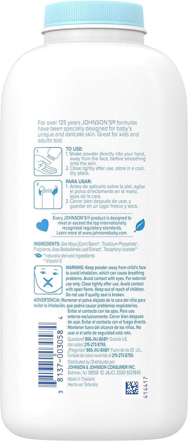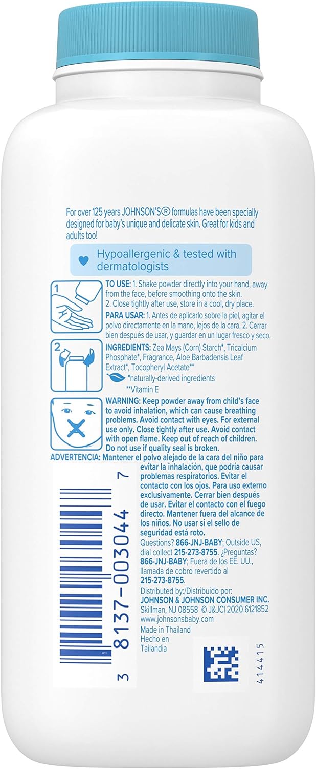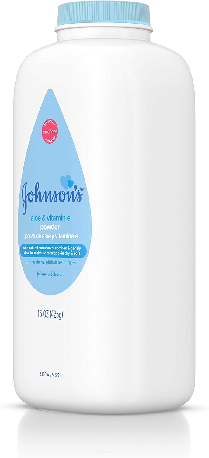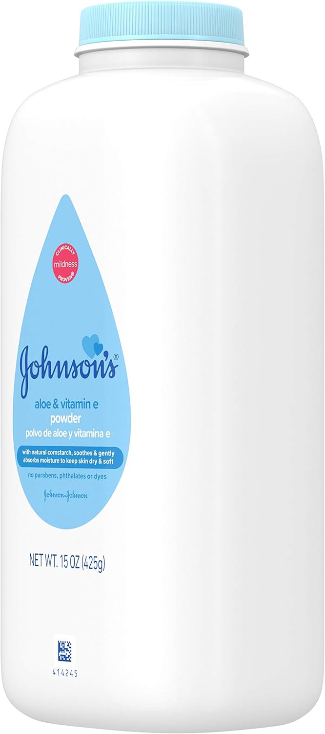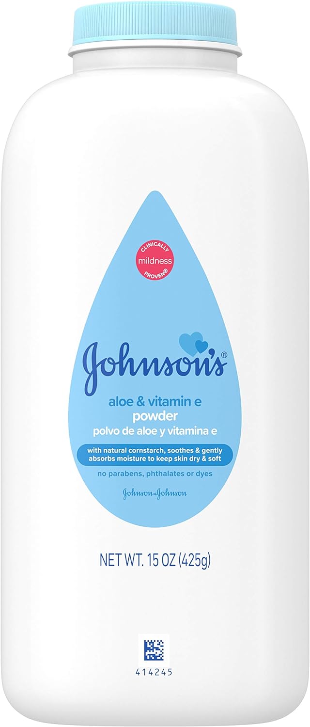 Johnson's Aloe & Vitamin E naturally derived cornstarch baby powder gently absorbs moisture to soothe delicate skin, and leave it feeling soft and smooth. Specially formulated for babies, this naturally derived cornstarch baby powder is dermatologist tested and clinically proven mild and gentle. This hypoallergenic baby powder is free of parabens, phthalates, dyes, and harsh fragrances. Formulated to be gentle, never harsh, this powder has a light, silky texture for easy application. It's great for kids and adults, too! Try it at the beach to help easily remove sand or use it as a dry shampoo alternative for adults.