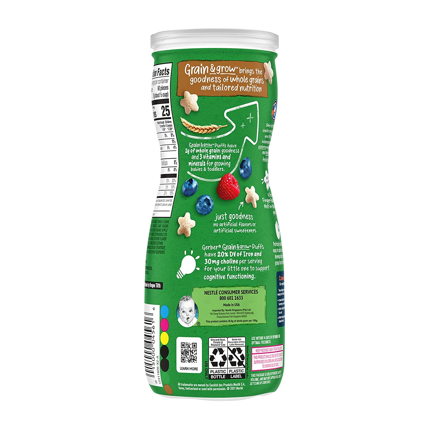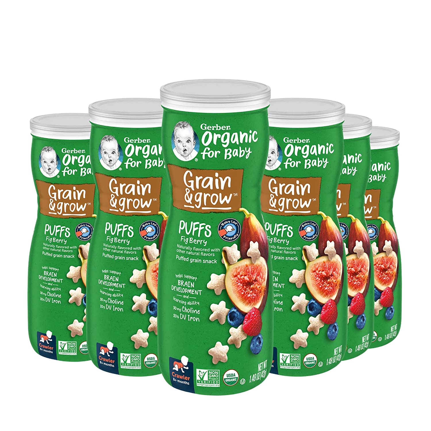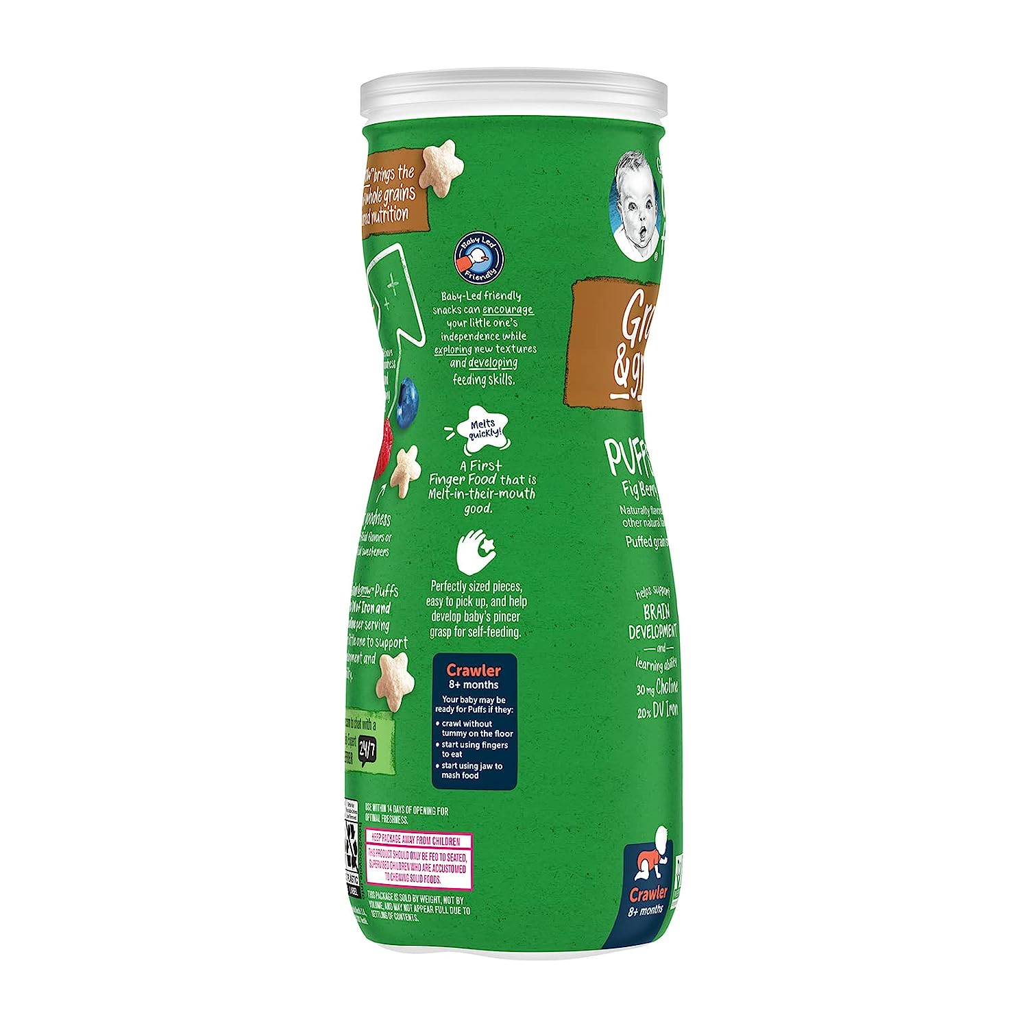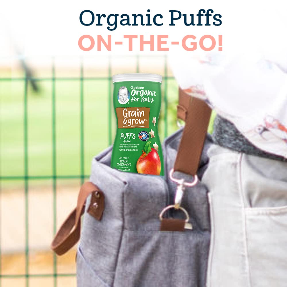 Nourish your little one with whole grain goodness by serving Gerber Organic Puffs Cereal Snack at snack time. Gerber Organic Puffs Cereal Snack have 2 grams of whole grains per serving, and Vitamin E, Zinc and Iron for healthy growth and development. Gerber Organic Puffs Cereal Snack are specially designed to dissolve easily and are just the right size for little hands to pick up and enjoy.