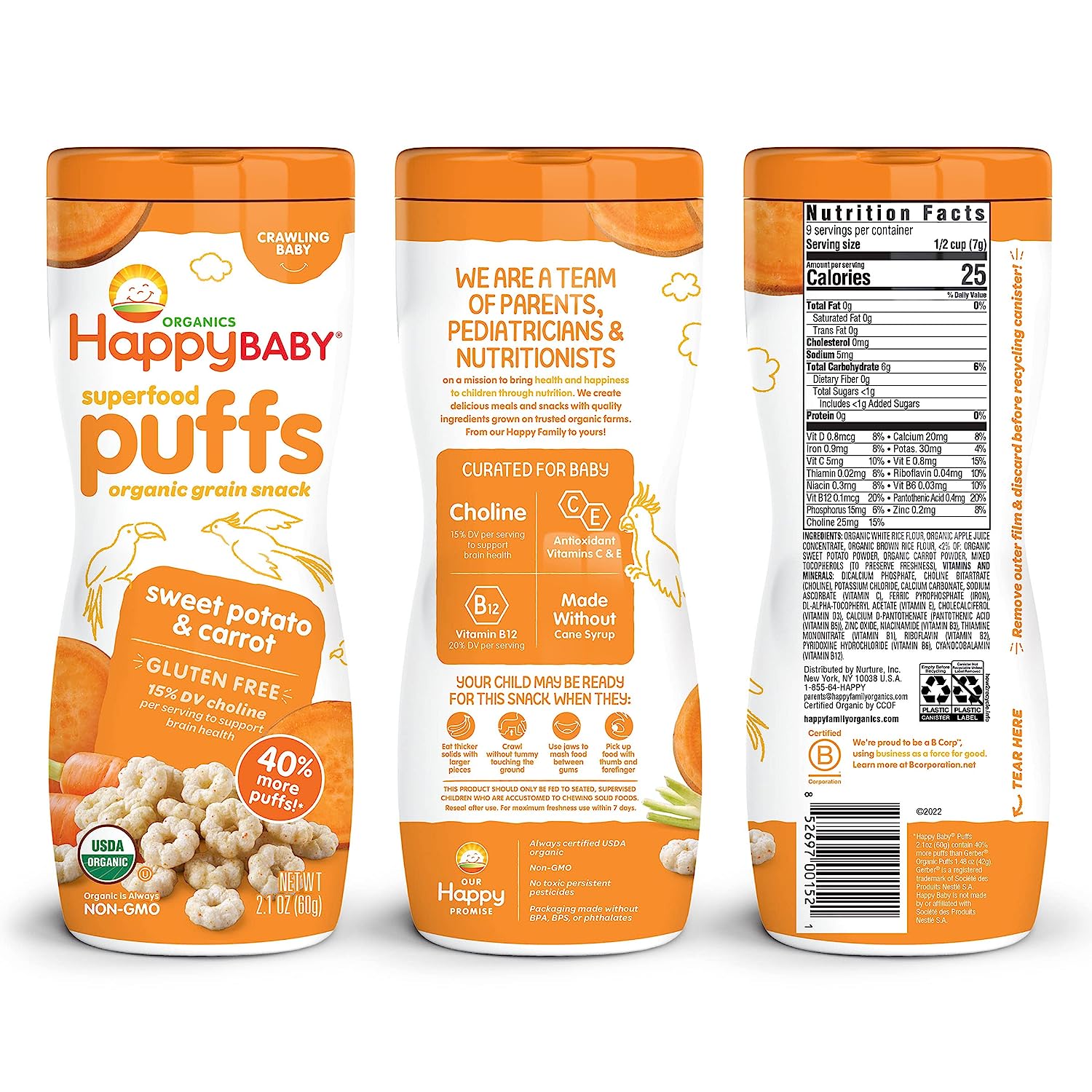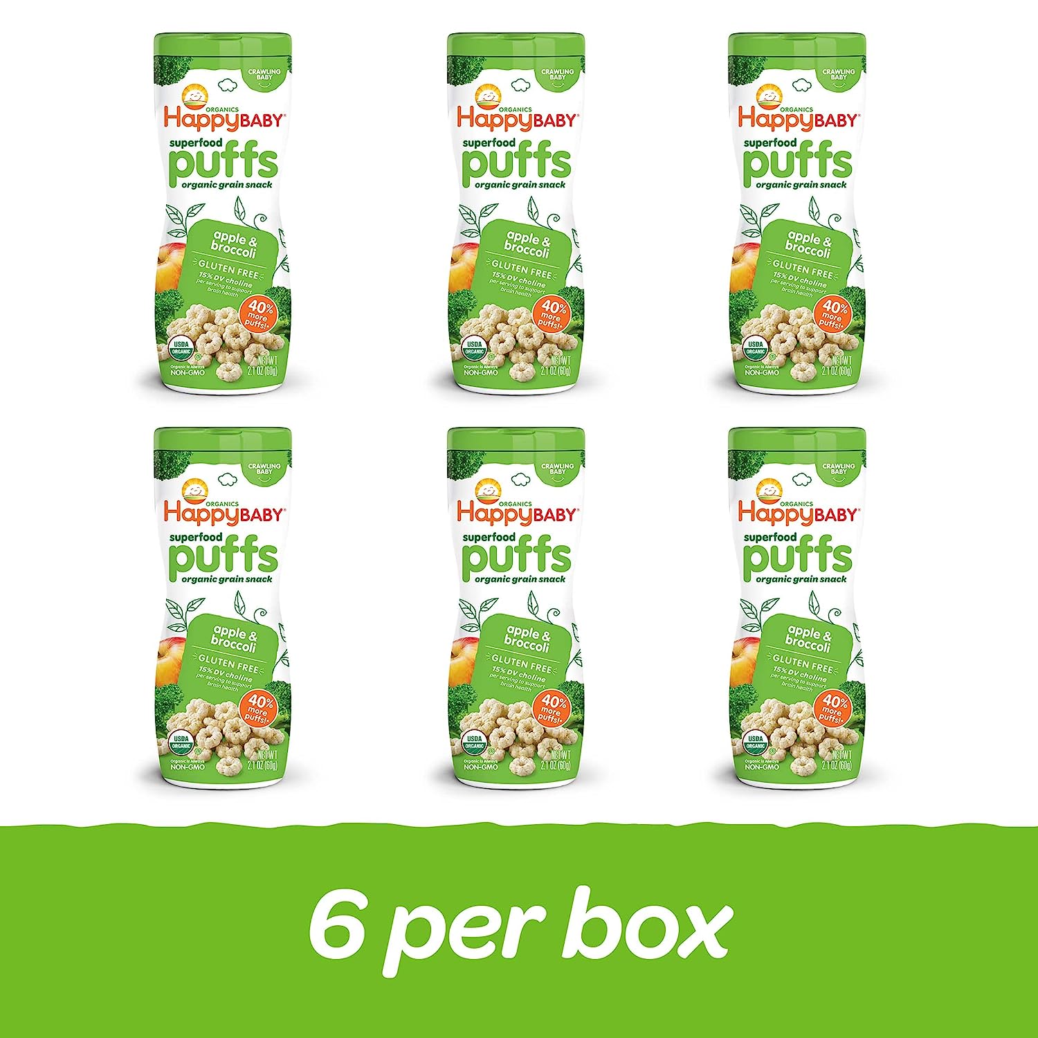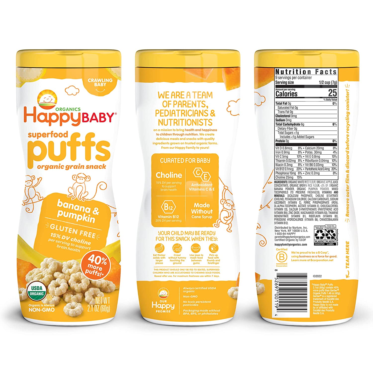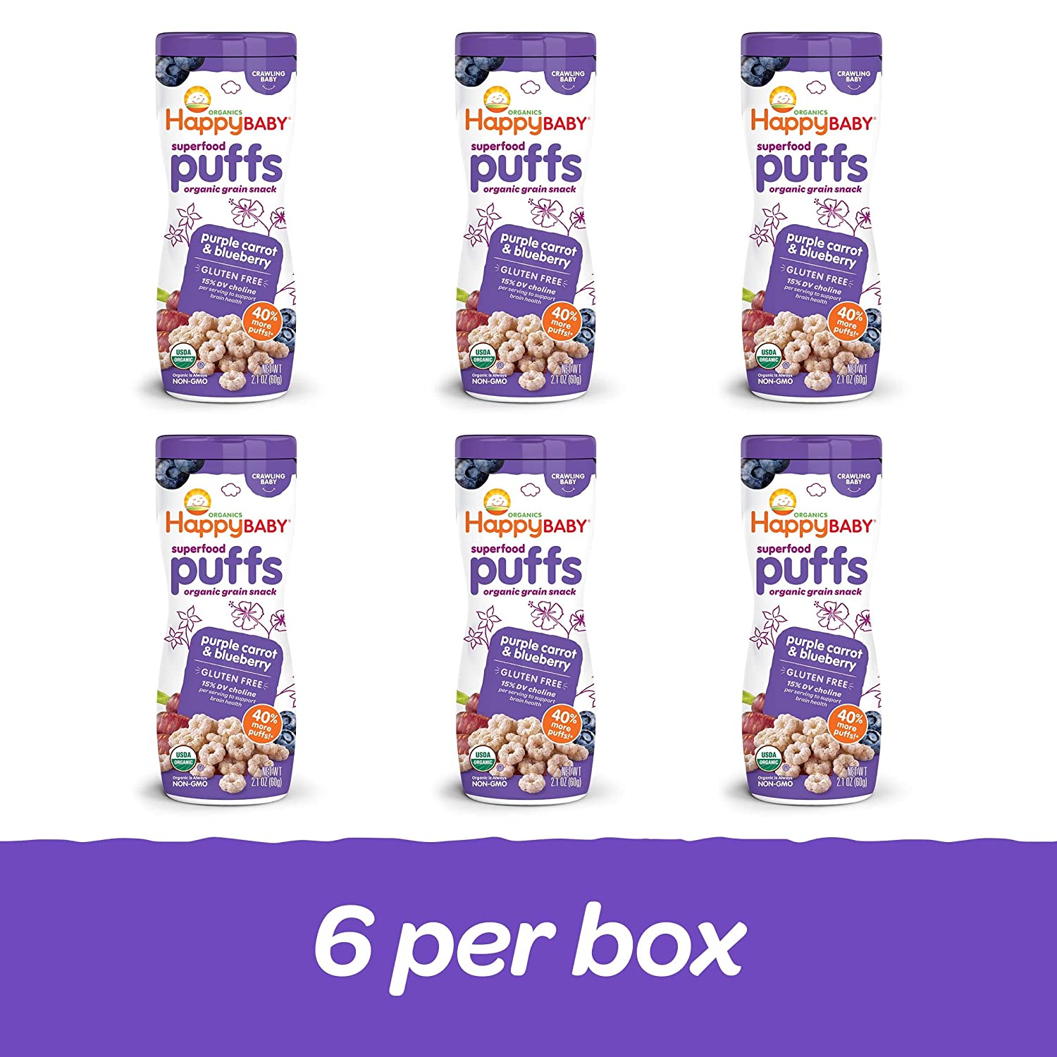 Parents, meet your pantry’s unsung hero. Happy Baby Puffs are a melt-in-your-mouth organic snack fortified with Choline for eye and brain health. Irresistible in taste and texture, they’re perfect for teaching babies tactility and self-feeding. Try this convenient variety pack with one container of each of our flavors.