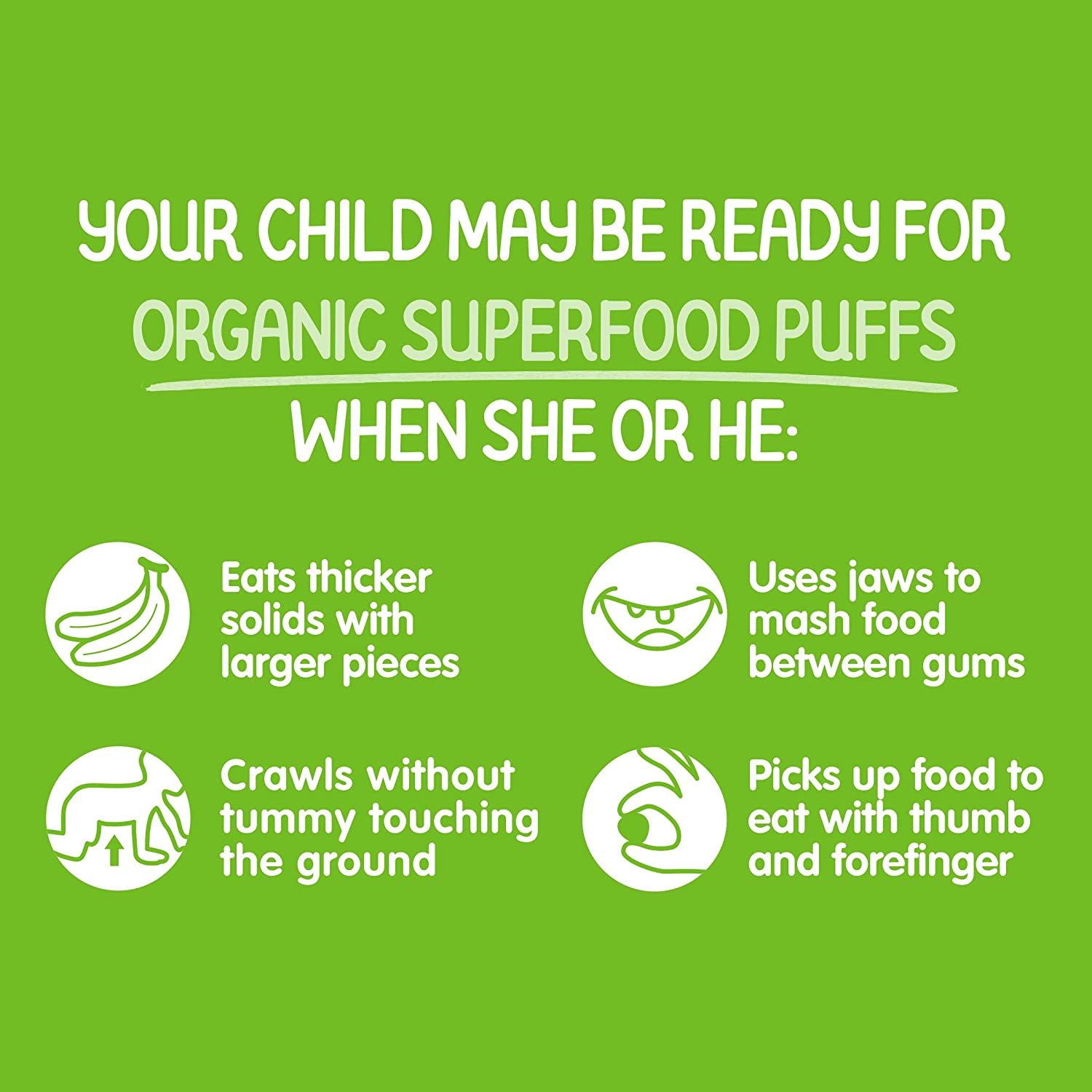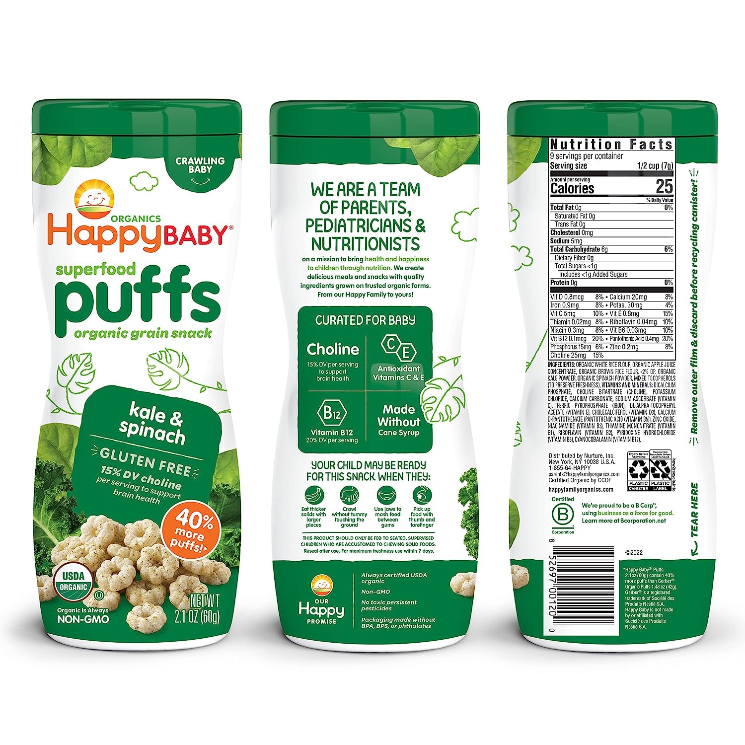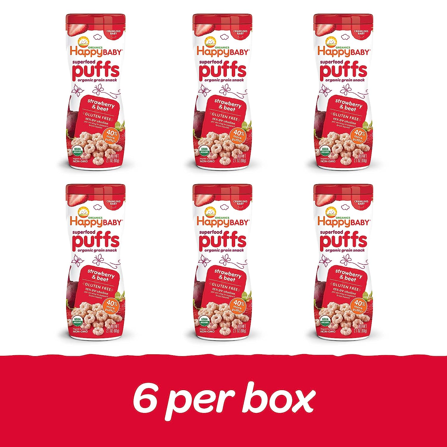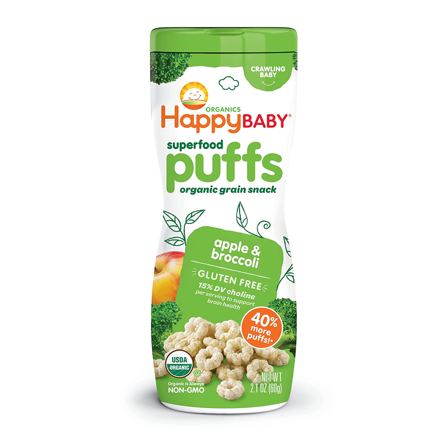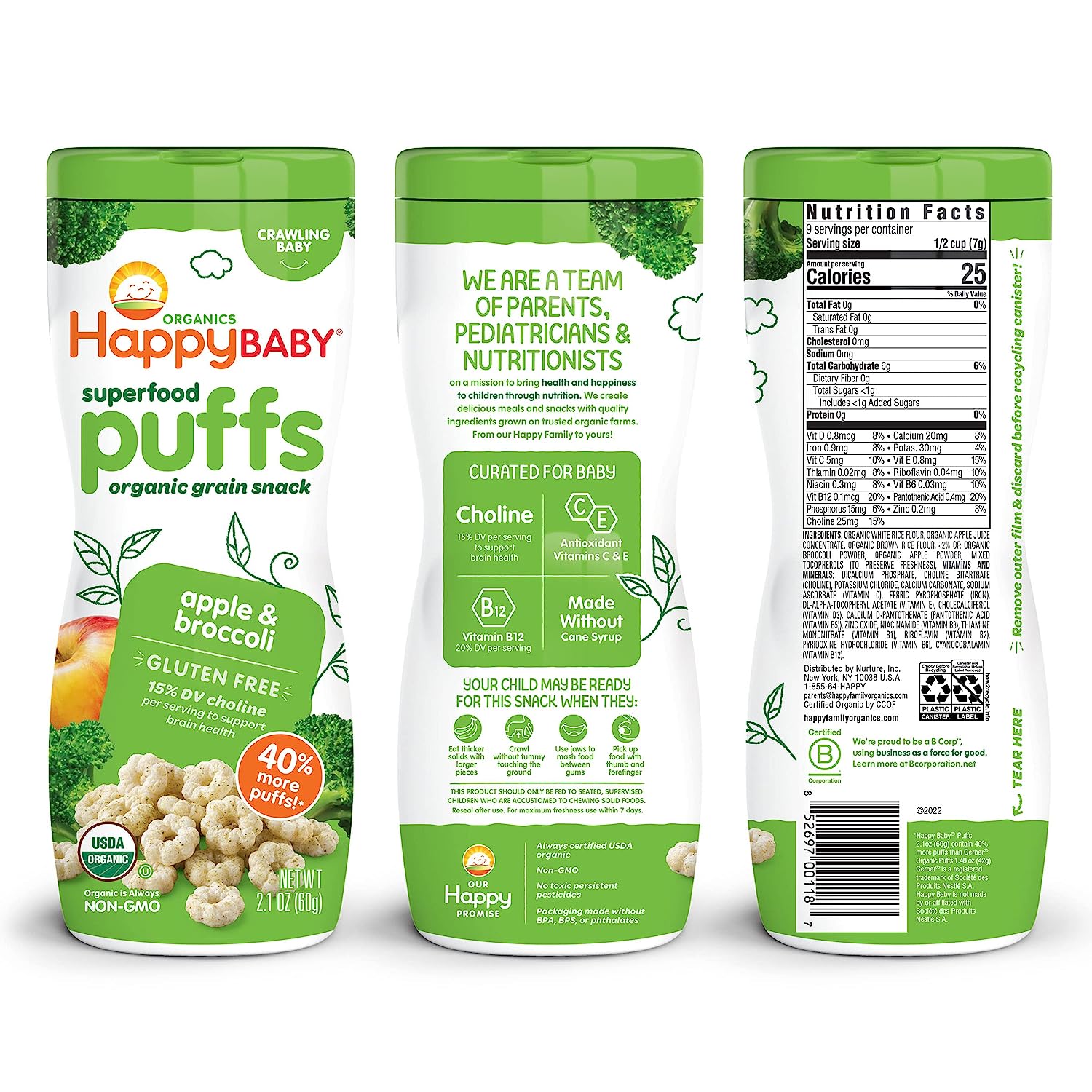 Parents, meet your pantry’s unsung hero. Happy Baby Puffs are a melt-in-your-mouth organic snack fortified with Choline for eye and brain health. Irresistible in taste and texture, they’re perfect for teaching babies tactility and self-feeding. Try this convenient variety pack with one container of each of our flavors.