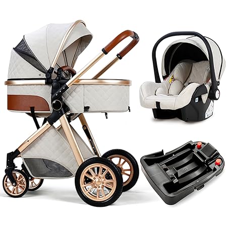 3 in 1 Baby Travel System Infant Baby Stroller Pushchair High Landscape Reversible Foldable Portable Stroller Newborn Pram Reclining Baby Carriage (with Base Beige)
