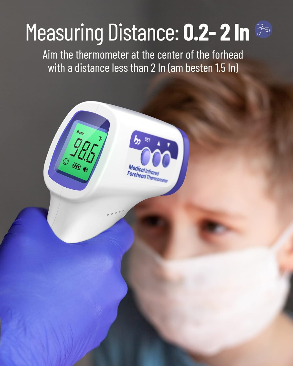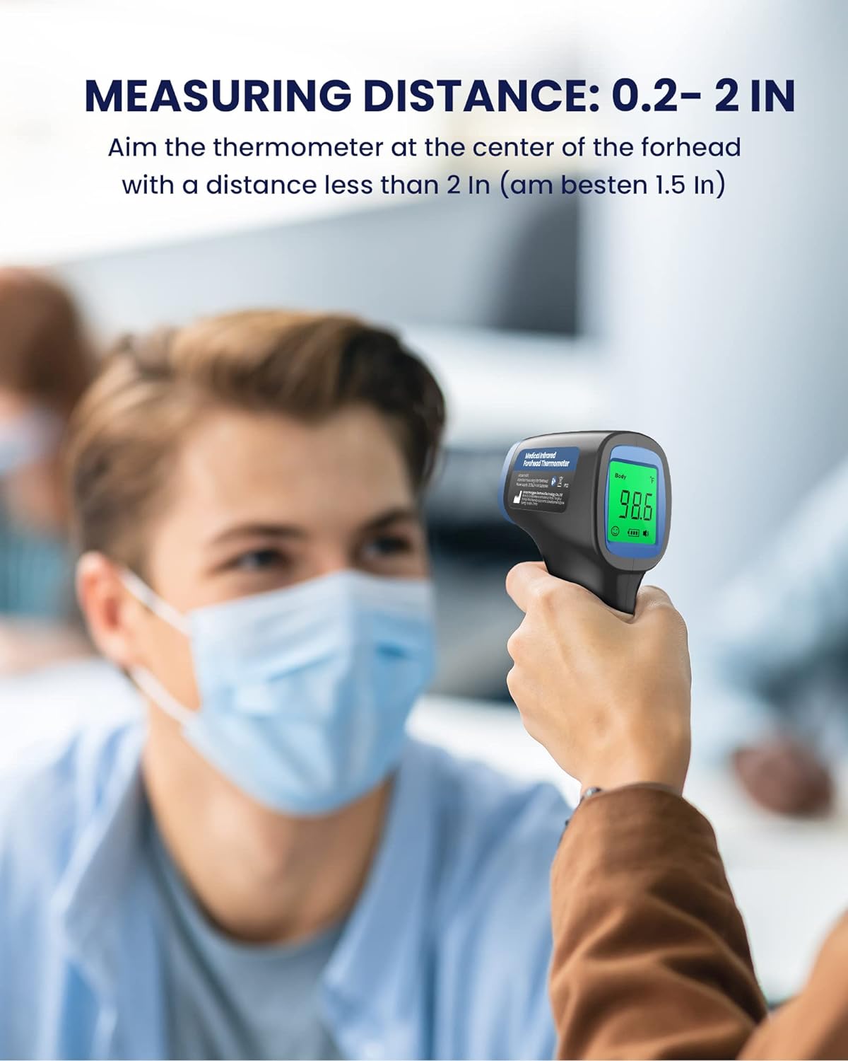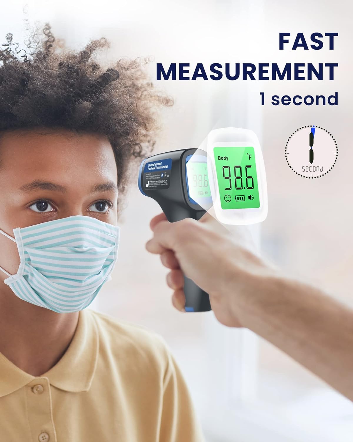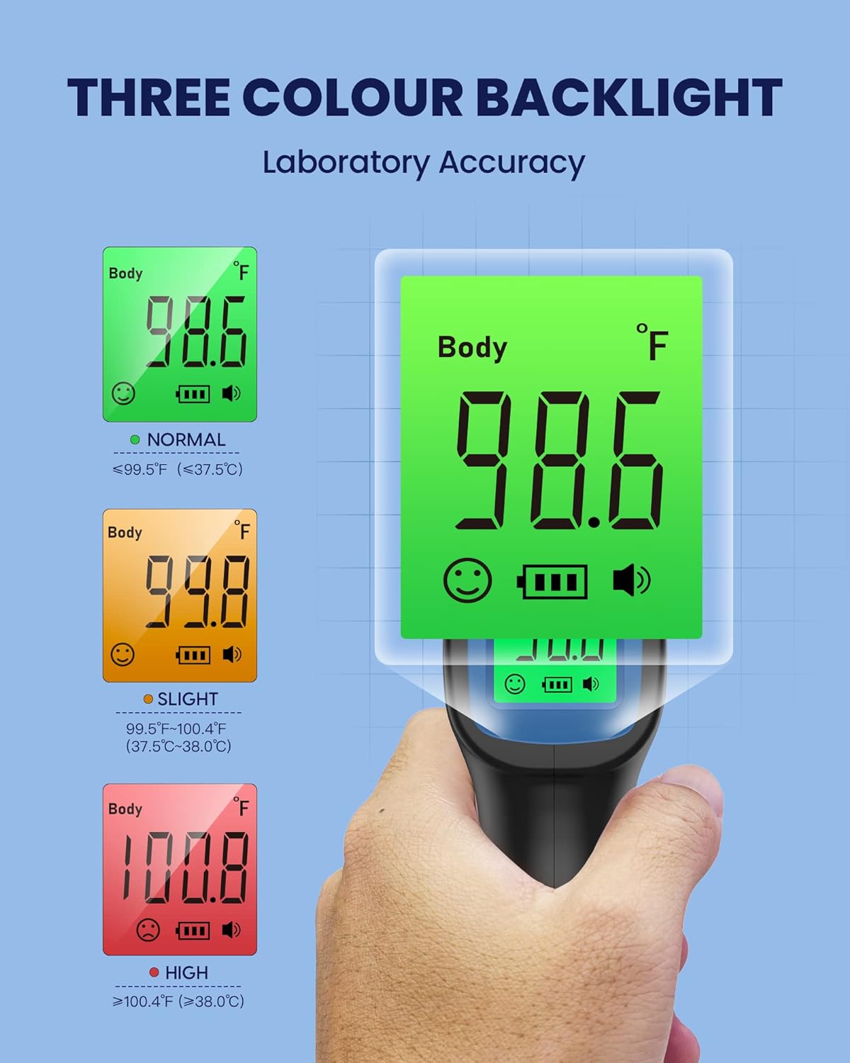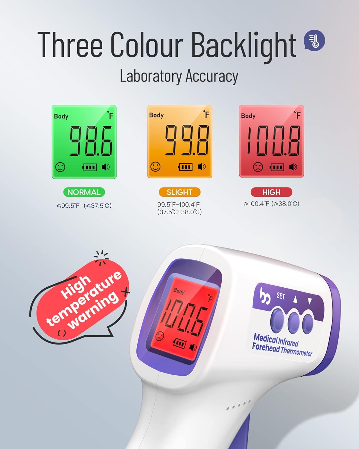 • [ HIGH FEVER ALERT ] : The digital forehead thermometer with LCD display clearly shows your temperature and alerts you with different lights- it shows green light for normal temperature (T≤99.5℉), yellow light for mild fever (99.5-100.2℉) and red light for high fever (T≥100.2℉). When the abnormal temperature occurs, it will be accompanied with a warning sound.