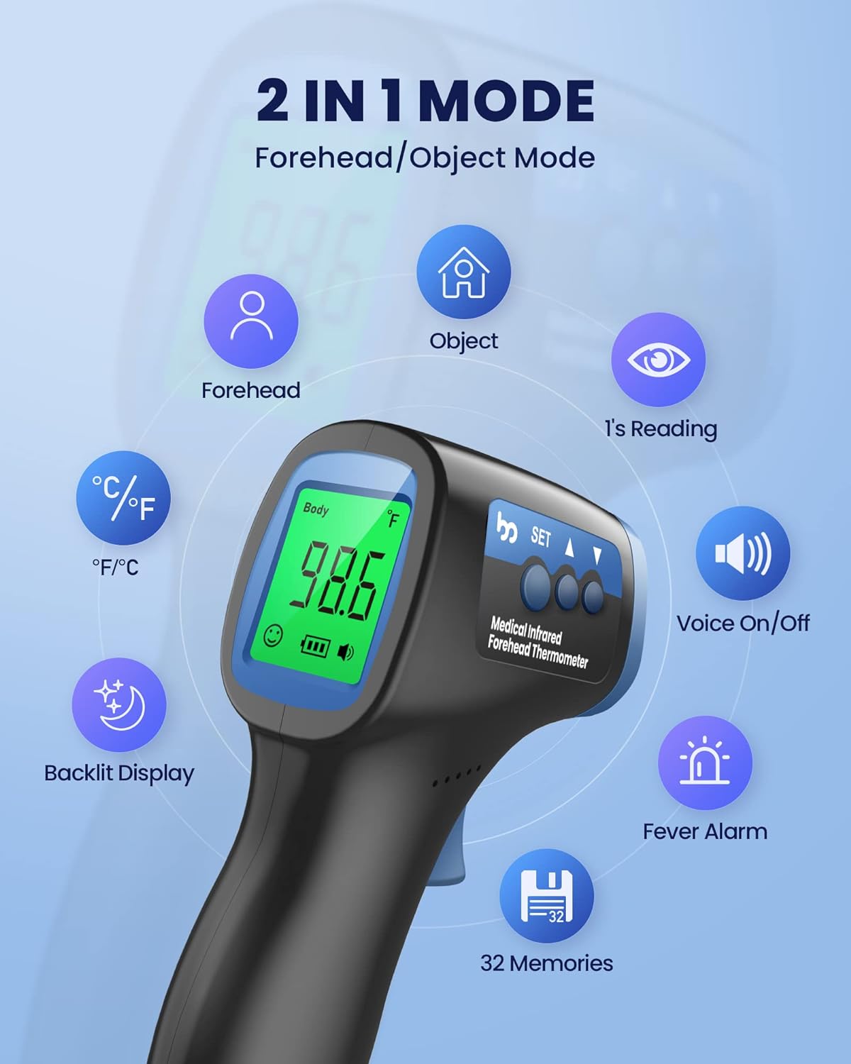 • [ MULTIPLE MODES ] : The digital infrared thermometer is specially designed for babies, adults and seniors. In addition to measuring body temperature, it can also measure room temperatures as well as solid and liquid temperatures, such as baby milk, water, food, etc.