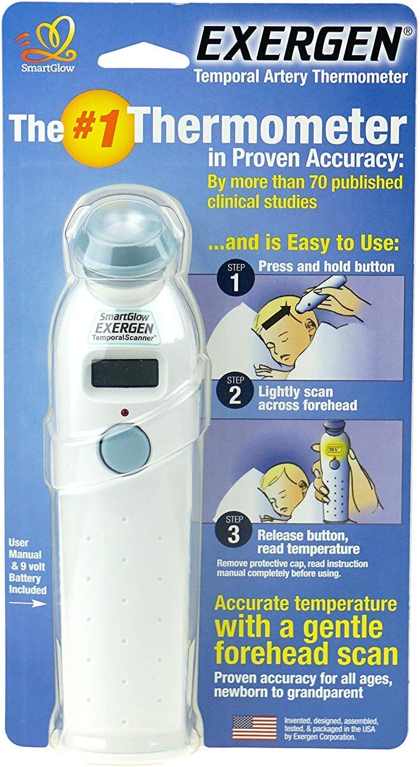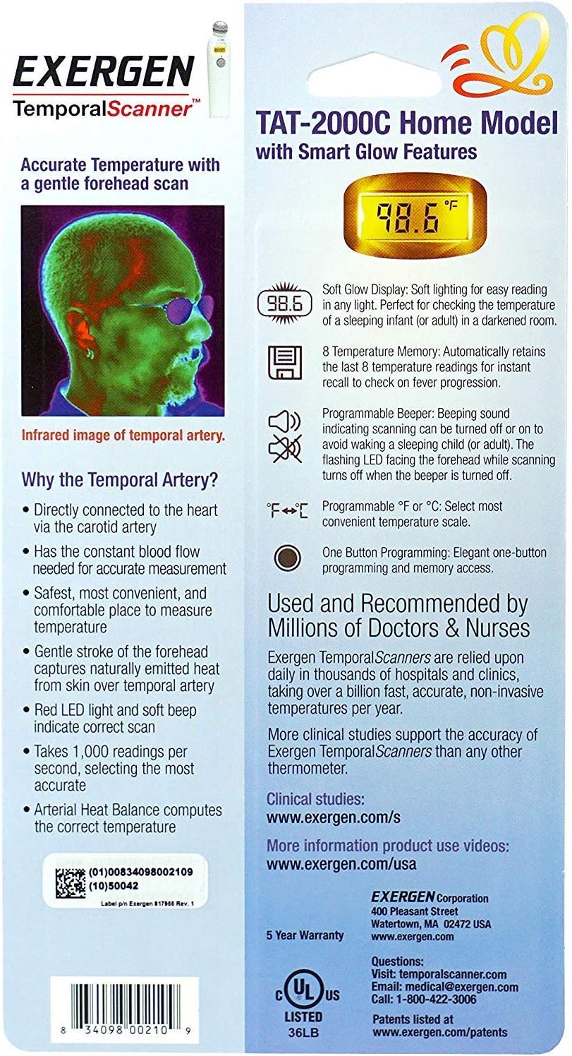 EXERGEN TEMPORAL ARTERY THERMOMETER TAT-2000C SCAN The TemporalScanner Thermometer is a totally non-invasive system with advanced infrared technology providing maximum ease of use with quick, consistently accurate measurements. Advanced, patented technology measures temperatures with a gentle stroke across the forehead. It captures naturally emitted heat from the skin above the temporal artery 1,000 times a second, and then gives a reading of the most accurate temperature. Use on sleeping child, or with ear pain/infection. No probe covers necessary. Accuracy comparable to rectal temperature. More accurate than ear thermometers. (Harvard Medical School study on infants)