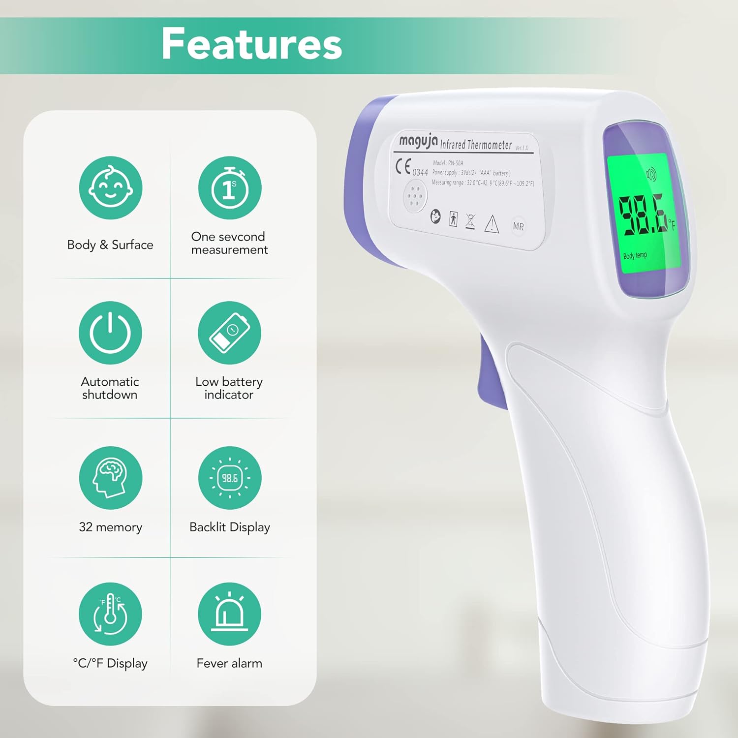 • ➤【Friendly Design】The no-touch digital thermometer has a non-slip design, and the LCD display is clear and easy to read, the display can be used at night without in light. The thermometer is equipped with an internal memory that can store up to 40 sets of data readings that allows you to keep track of the historical temperature changes for you and your family.