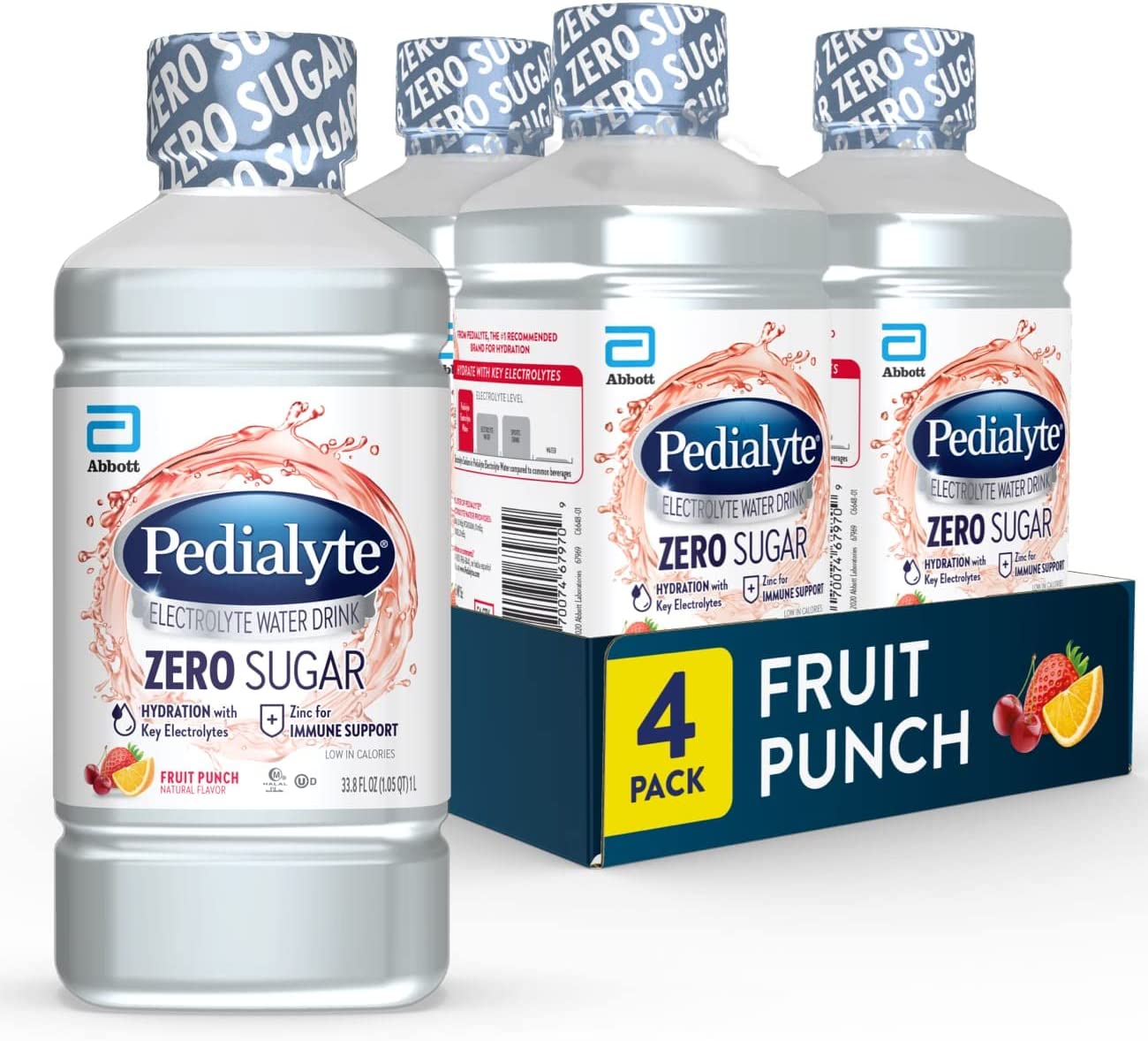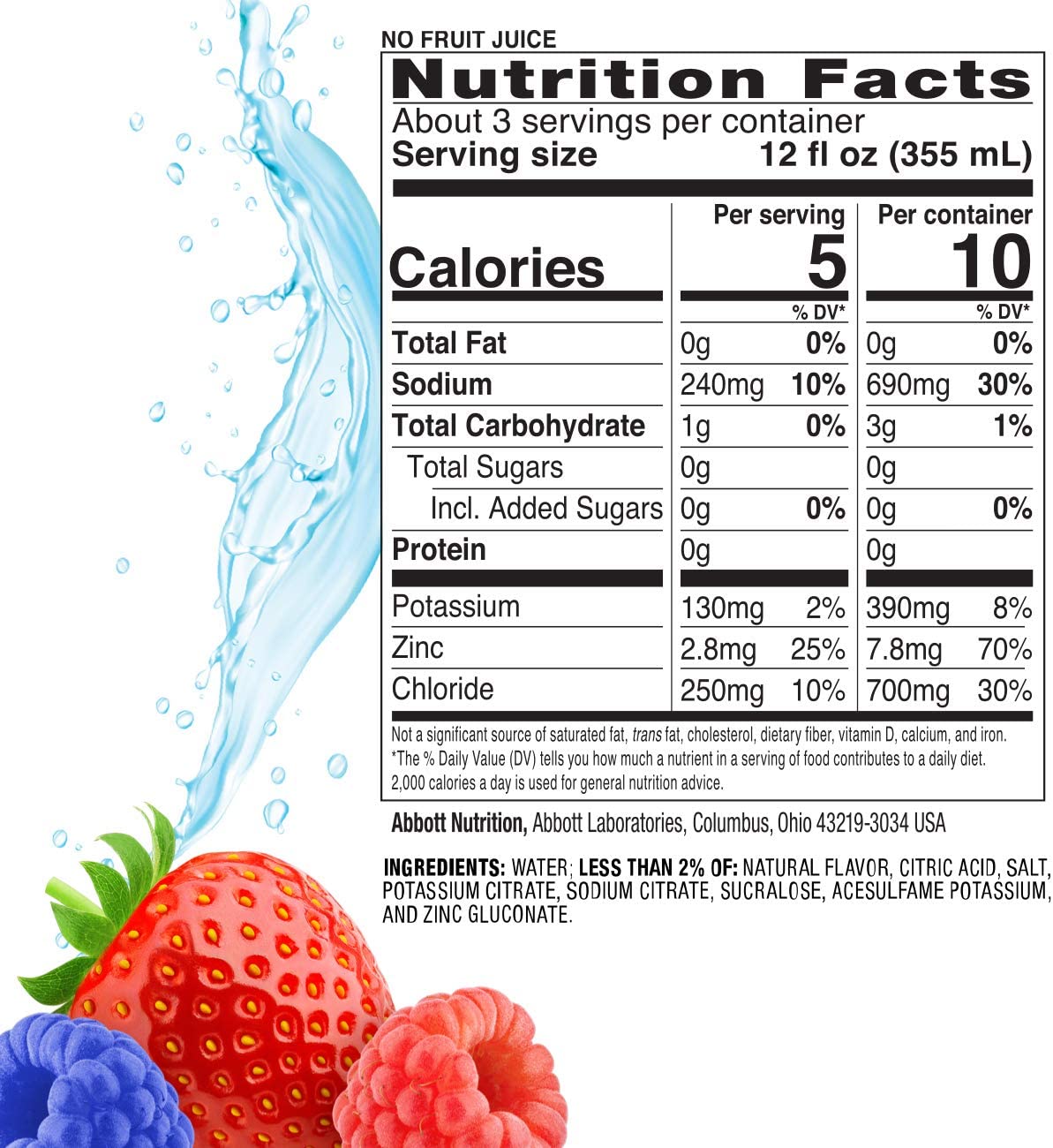 Pedialyte Electrolyte Water is hydration with 3 key electrolytes: sodium, chloride, and potassium. Designed for adults, it has zinc for immune support and zero sugar.* Our refreshing electrolyte water comes in 2 great flavors, Berry Frost and Fruit Punch, and has 50% more electrolytes than leading sports drinks and electrolyte waters.† It is non-GMO‡ and gluten-free, with no artificial colors or flavors. Pedialyte Electrolyte Water is not for children under 5 years of age for mild to moderate dehydration. * Low in calories. † 30 mEq sodium electrolytes per liter vs 20 mEq in leading sports drinks and electrolyte waters. ‡ Ingredients not genetically engineered.