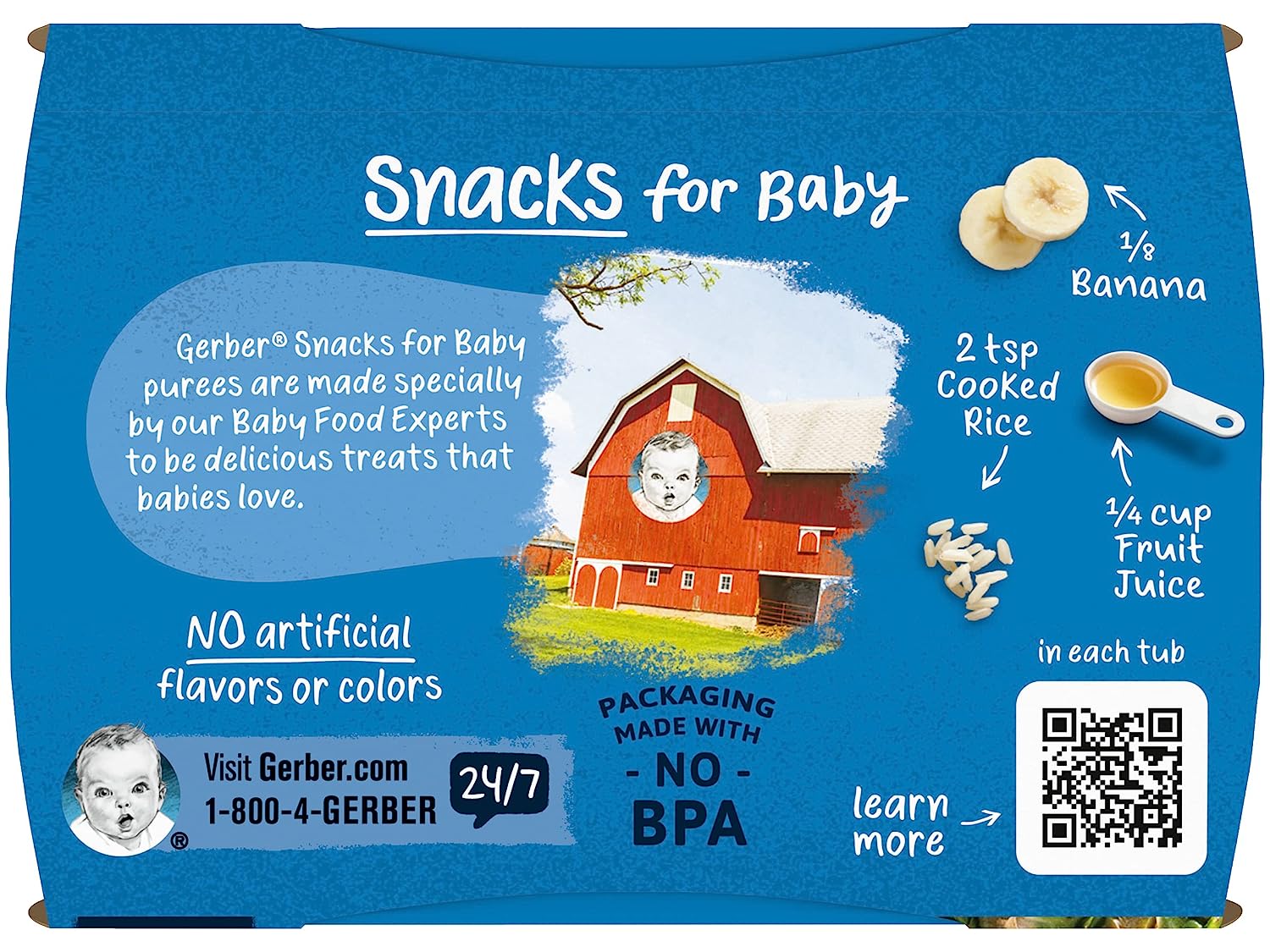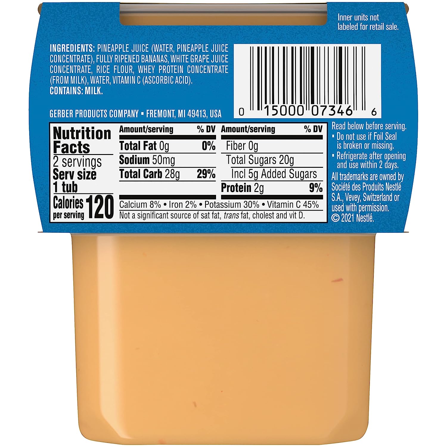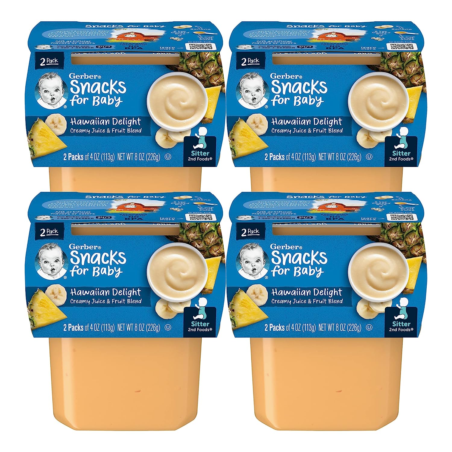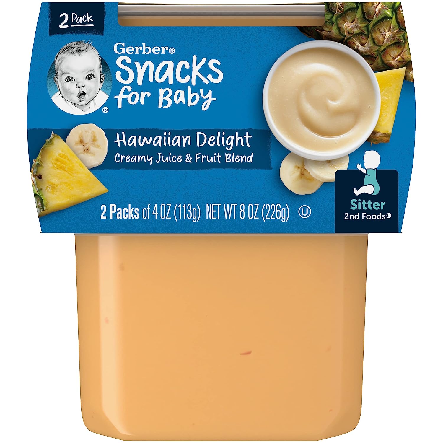 Gerber Snacks for Baby 2nd Foods Baby Food Tubs, Hawaiian Delight Creamy Juice & Fruit Blend, 2 Packs of 4-Ounce Tubs, Made for Sitters: Gerber Snacks for Baby purees are made specially by our Baby Food Experts to be delicious treats that babies love. Continue your baby’s love of fruits with Gerber 2nd Foods Hawaiian Delight baby food. Gerber 2nd Foods baby food helps expose babies to a variety of tastes and ingredient combinations which is important to help them accept new flavors. All our recipes are made with fruits and veggies that meet Gerber’s high quality standards. This recipe includes a lot of love, care, 1/8 banana, 1/4 cup fruit juice and 2 tsp cooked rice in each tub. These Gerber Baby Food Tubs are Non-GMO with no added sweeteners or starch and no artificial flavors or colors. Directions: Refrigerate after opening and use within 2 days. Gerber Snacks for Baby 2nd Foods Baby Food comes in 2 Packs of 4-Ounce Hawaiian Delight Baby Food Tubs. Gerber Baby Food Tubs packaging is made with no BPA.