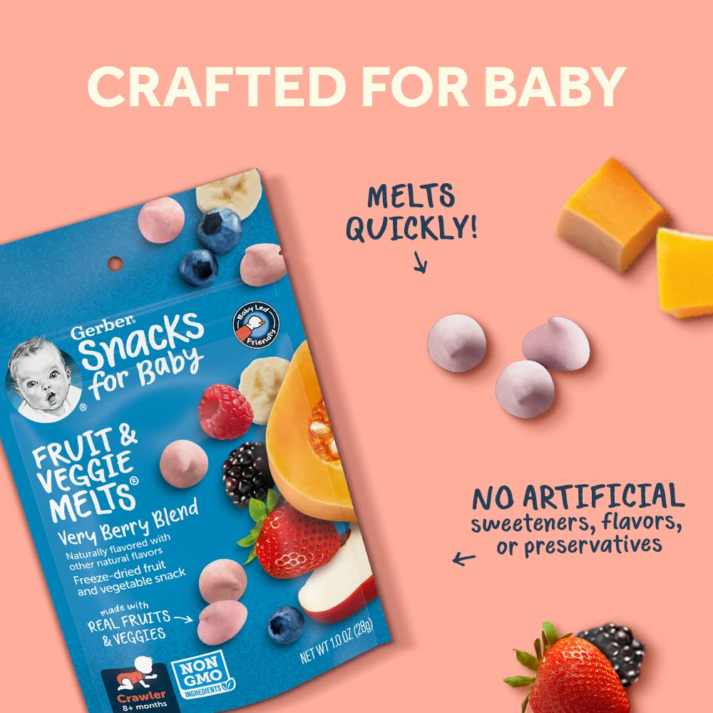 Nourish your little one with the goodness of Gerber Graduates Very Berry Blend Fruit & Veggie Melts Freeze-Dried Fruit & Veggie Snacks. These tasty snacks are made with real fruit and veggies. With a good source of Vitamins A, C, and E, these snacks combine the delicious taste little ones love with the wholesome nutrition parents love.