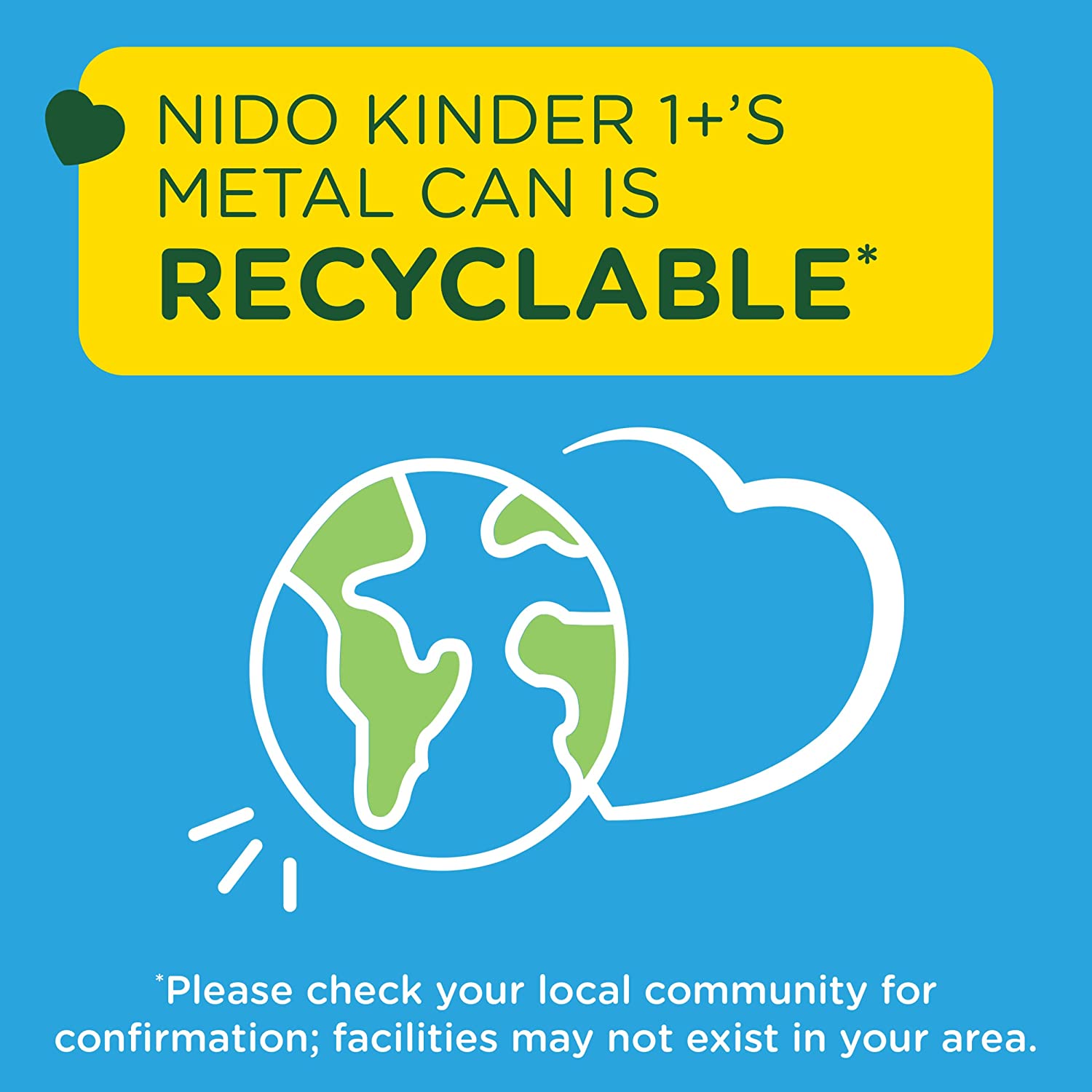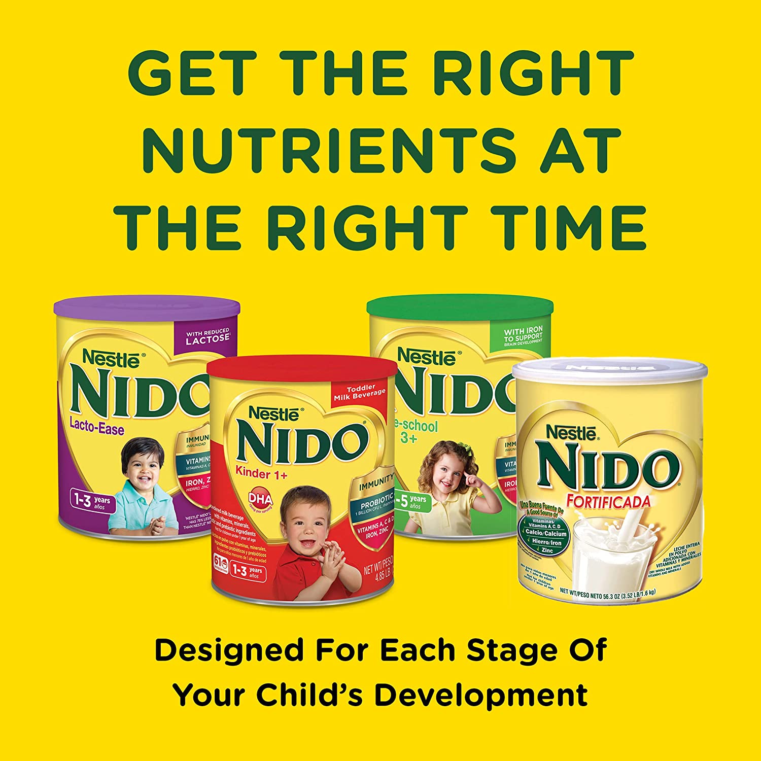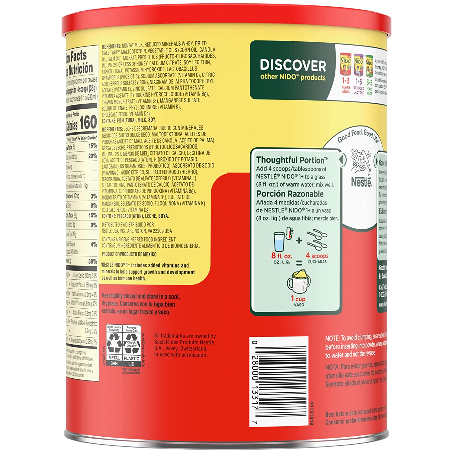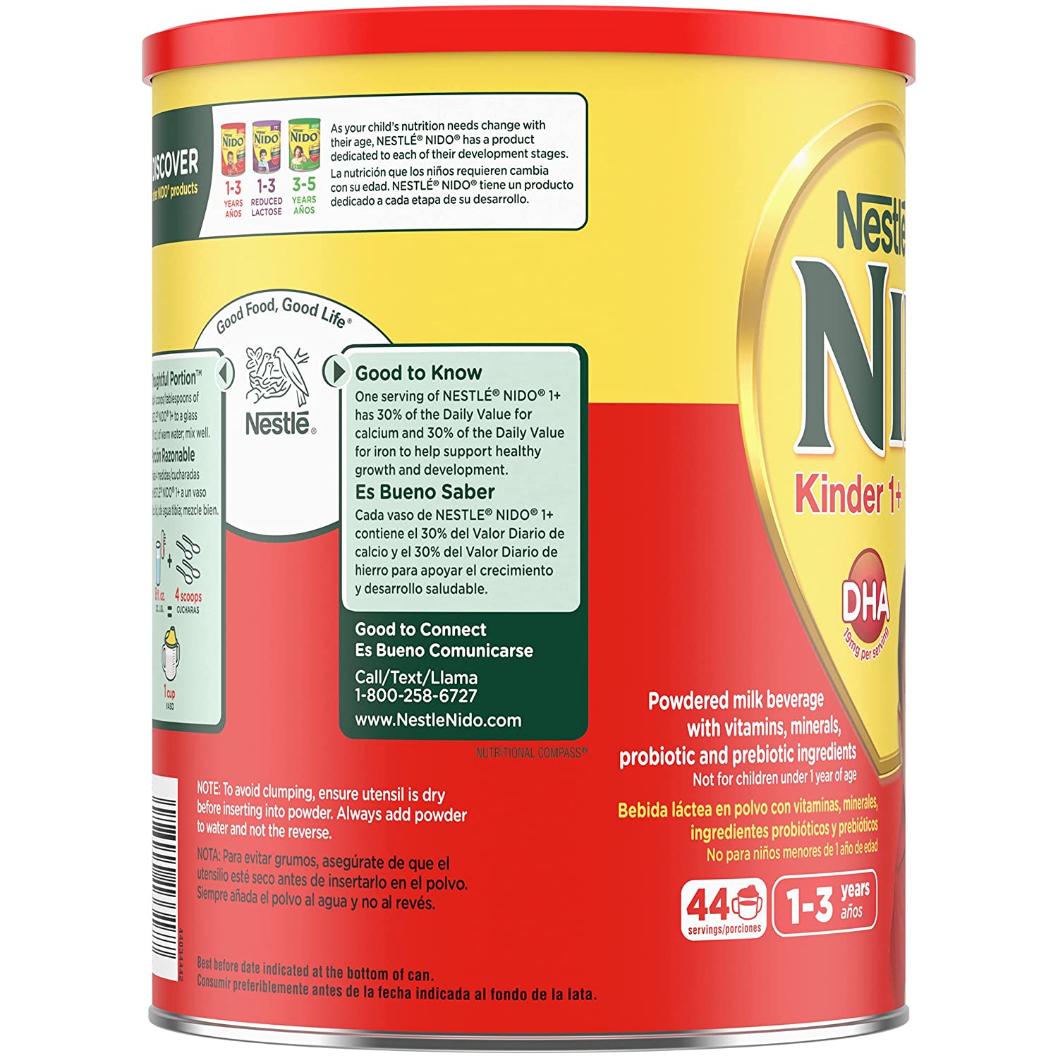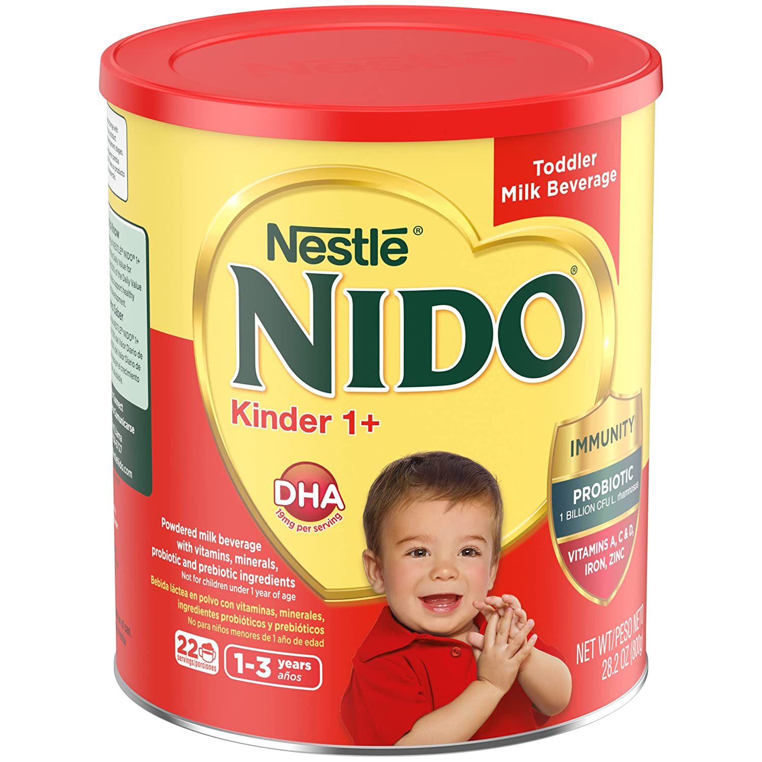 Nestle NIDO Kinder 1+ Toddler Milk Beverage delivers 13 essential vitamins and minerals in every cup. This toddler drink contains Vitamin A, Vitamin C, Vitamin D, iron and zinc among other vitamins and minerals to help support healthy growth and development. NIDO Kinder 1+ toddler powder milk beverage now also includes a probiotic along with Vitamins A, C, D, Iron, Zinc to help support immunity. NIDO 1+ contains 19 mg Omega-3 DHA and iron to help support healthy brain development. This toddler milk beverage is easy to mix. Simply add 4 scoops of Nestle NIDO 1+ to 1 cup of warm water and mix well for a nutritional drink for toddlers you can trust for your child. As your child graduates from baby formula, and you search for a beverage for your toddler, NIDO has you covered. NIDO Kinder 1+ is for toddlers ages 1-3. Each 56.4 ounce canister of toddler milk beverage contains approximately 47 servings of NIDO Kinder 1+. Store your can of NIDO Kinder 1+ in a cool, dry place.