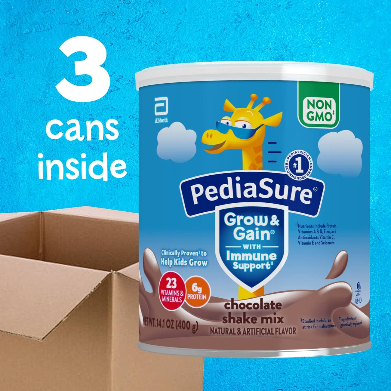 PediaSure Grow & Gain with Immune Support* kids shake mix is clinically proven† to help kids grow. It has 23 essential vitamins & minerals and 7 key nutrients for immune support,* including 6 grams of protein to help build muscles. PediaSure Grow & Gain is non-GMO,‡ gluten-free, has no artificial growth hormones,§ and is suitable for lactose intolerance.|| Just mix with water, add to a recipe or a smoothie, and enjoy. From the #1 pediatrician recommended brand. * Nutrients include protein, vitamins A & D, zinc, and antioxidants (vitamins C & E and selenium). † Studied in children at risk for malnutrition, 2 servings per day. ‡ Ingredients not genetically engineered. § No significant difference has been shown between milk derived from rbST-treated and non-rbST-treated cows. || Not for children with galactosemia.