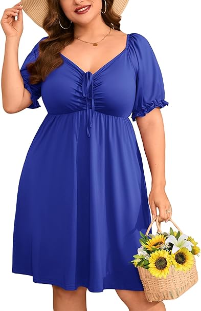 ZOMVA 2024 Plus Size Summer Dress Tie Front Sweetheart Neck Puff Short Sleeve Swing A Line Midi Causal Vacation Dresses