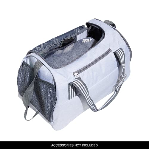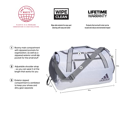 Details: This adidas duffel bag is designed for the gym, team travel or a weekend away. it has a roomy main compartment with inner zip pockets. a ventilated shoe garage keeps wet or muddy items separate. a mesh pocket at the other end holds your water bottle.