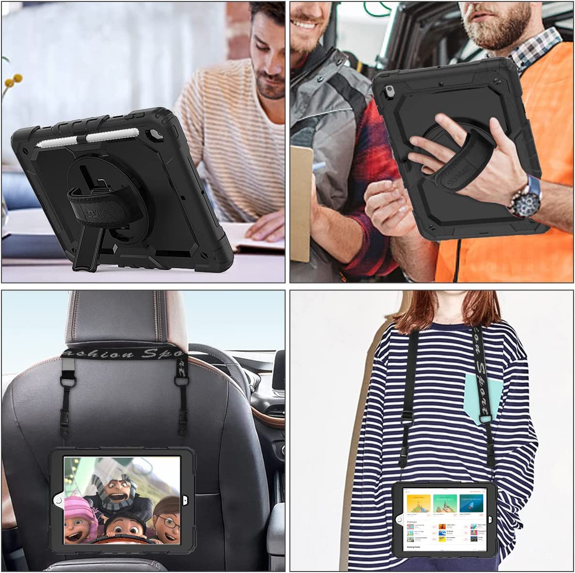 • Soft Strap & Portable Shoulder Strap & Rotating Stand: Provide the protection and convenience when you play or work with iPad. Hang it anywhere for your entertainment, makes you using iPad 9th/8th/7th Generation case easily. 360 Degrees rotating Kickstand provides convenient viewing, with soft strap, easy to use your iPad in your outdoor travelling, working, gaming with kids.
