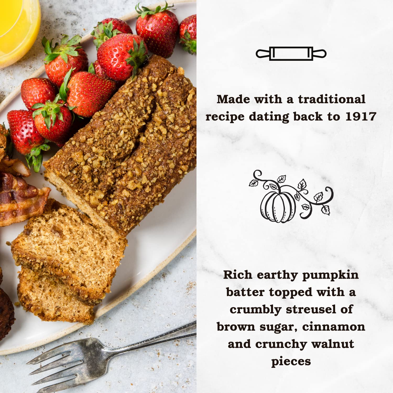 • PUT A SMILE ON EVERY FACE: We combined that earthy pumpkin flavor with the pie spices of cinnamon, nutmeg, allspice and cloves into our rich batter ropped with a crumbly streusel of brown sugar, cinnamon and crunchy walnut pieces.