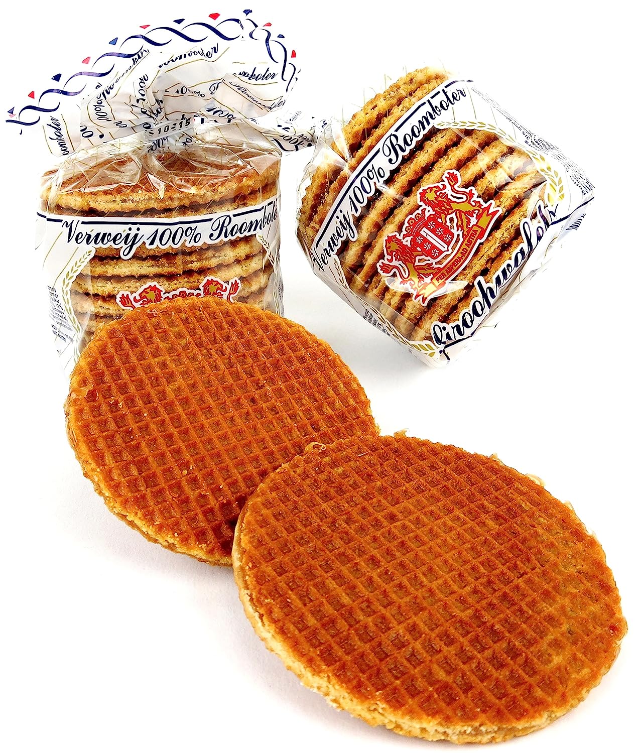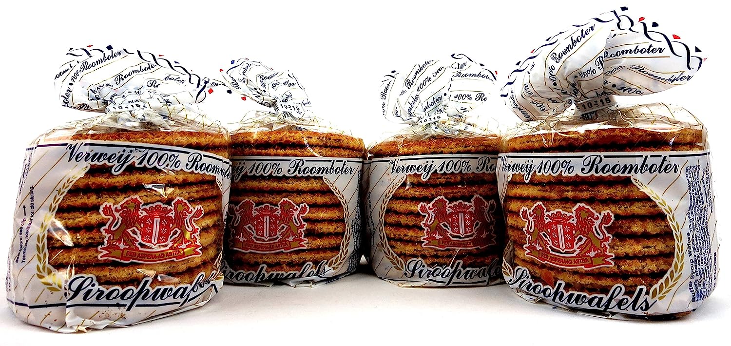 Stroopwafels, often referred to as caramel syrup waffles, are a popular Dutch cookie often enjoyed with tea or coffee that consists of two soft round Belgian waffle-like disks with caramel syrup in between them that creates a chewy center. Thought to have originated near the Dutch city of Gouda sometime in the 19th century, Stroopwafels are still widely enjoyed today. Each 10.6 oz package of Verweij 100% Roomboter Siroopwafels comes with 10 individual Stroopwafels.